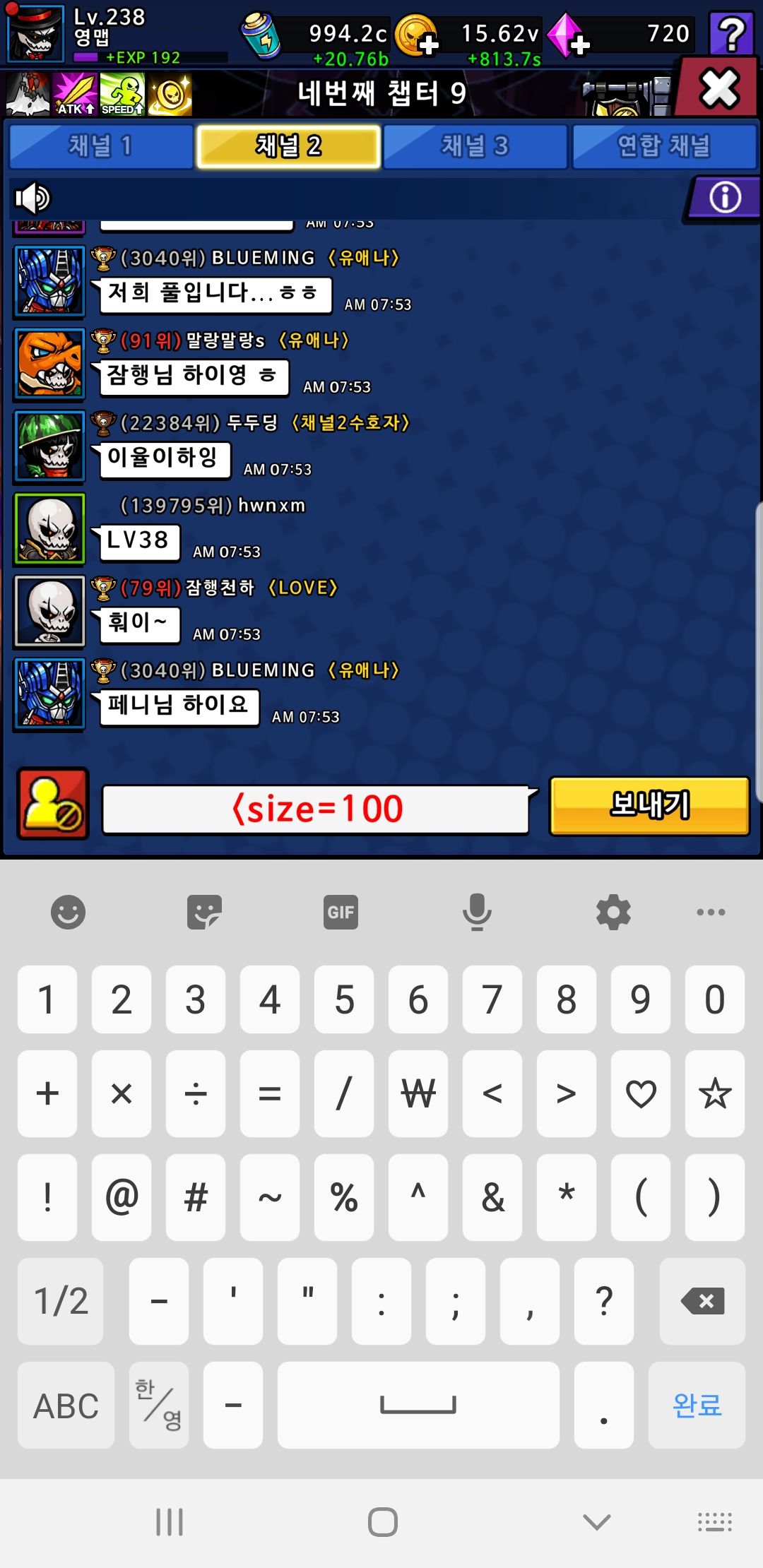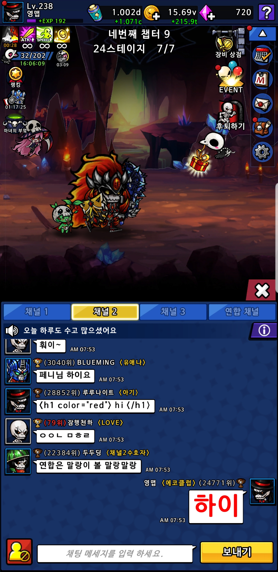 채팅에는 어이디 길드 랭킹이 표시된다. 채널은 3개까지 있고 가끔 GM 이 공지한다.