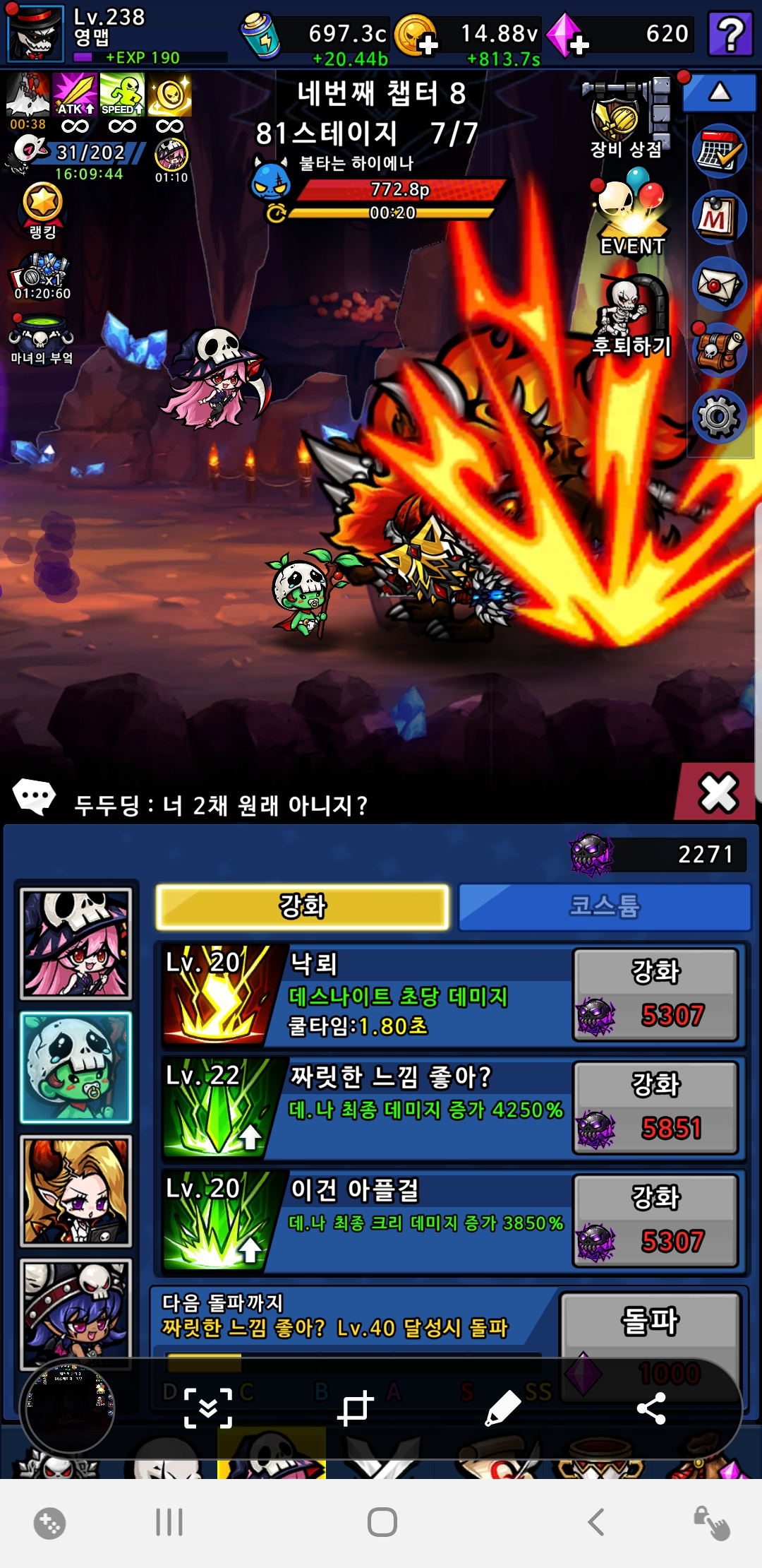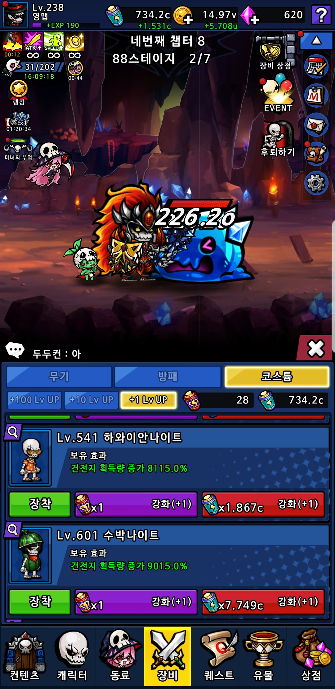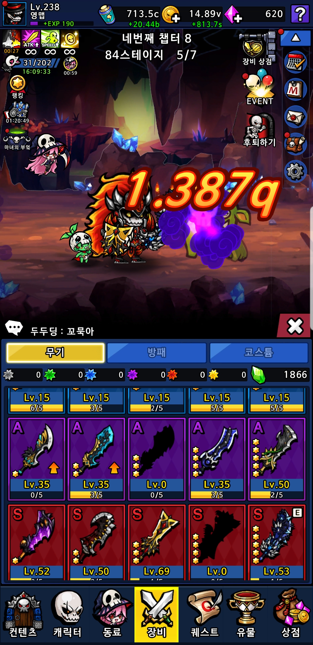 기존 방치형 게임과 첫 번째 차별되는 점은 초기화되는 환생시스템이 없고 그냥 쭉 레벨 업하면서 진행된다.