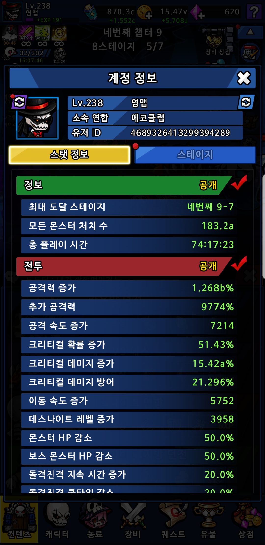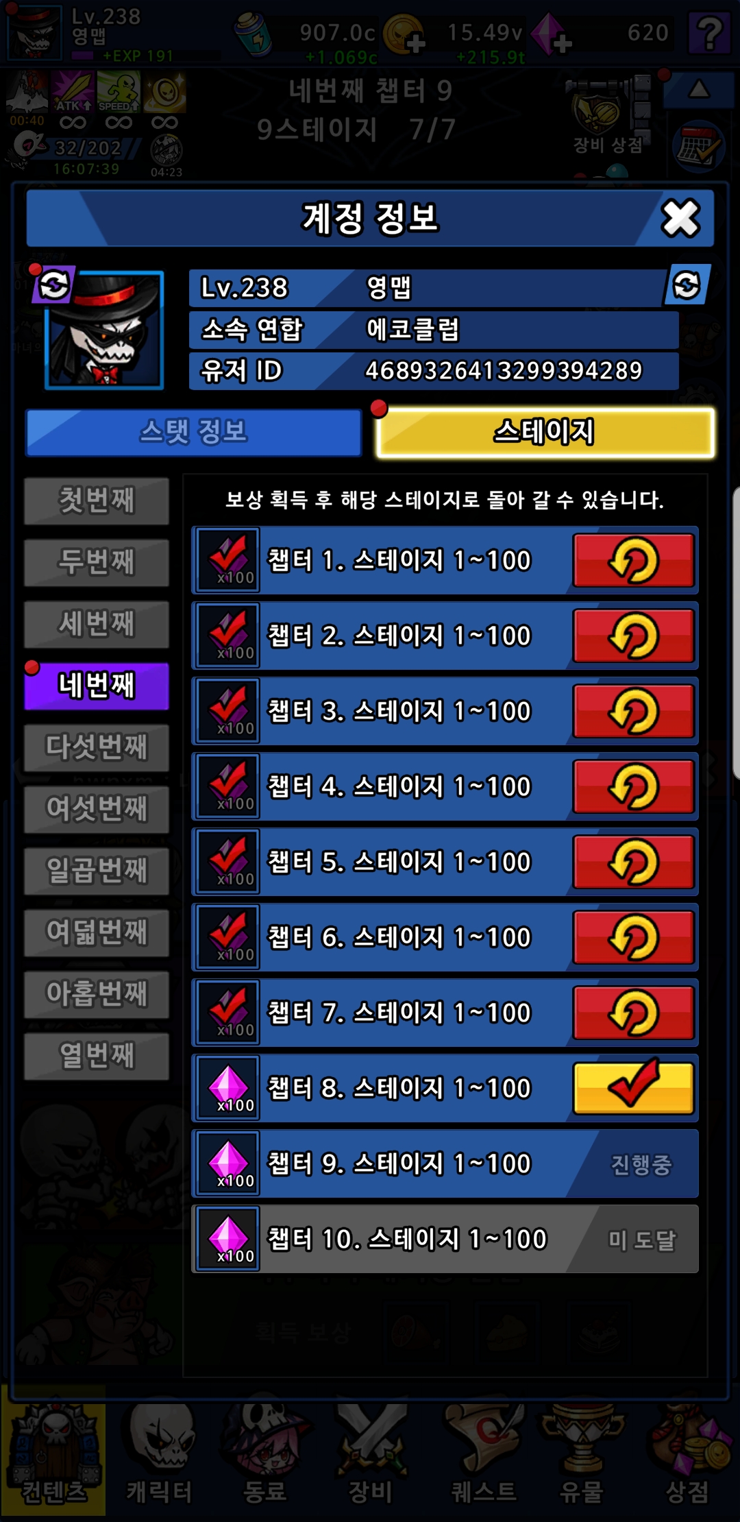 내가 클리어한 스테이지를 확인하고 보상을 받는 화면이다. 현재 진행 중인 스테이지가 너무 어려우면 적절한 스테이지로 이동해서 사냥을 하자.