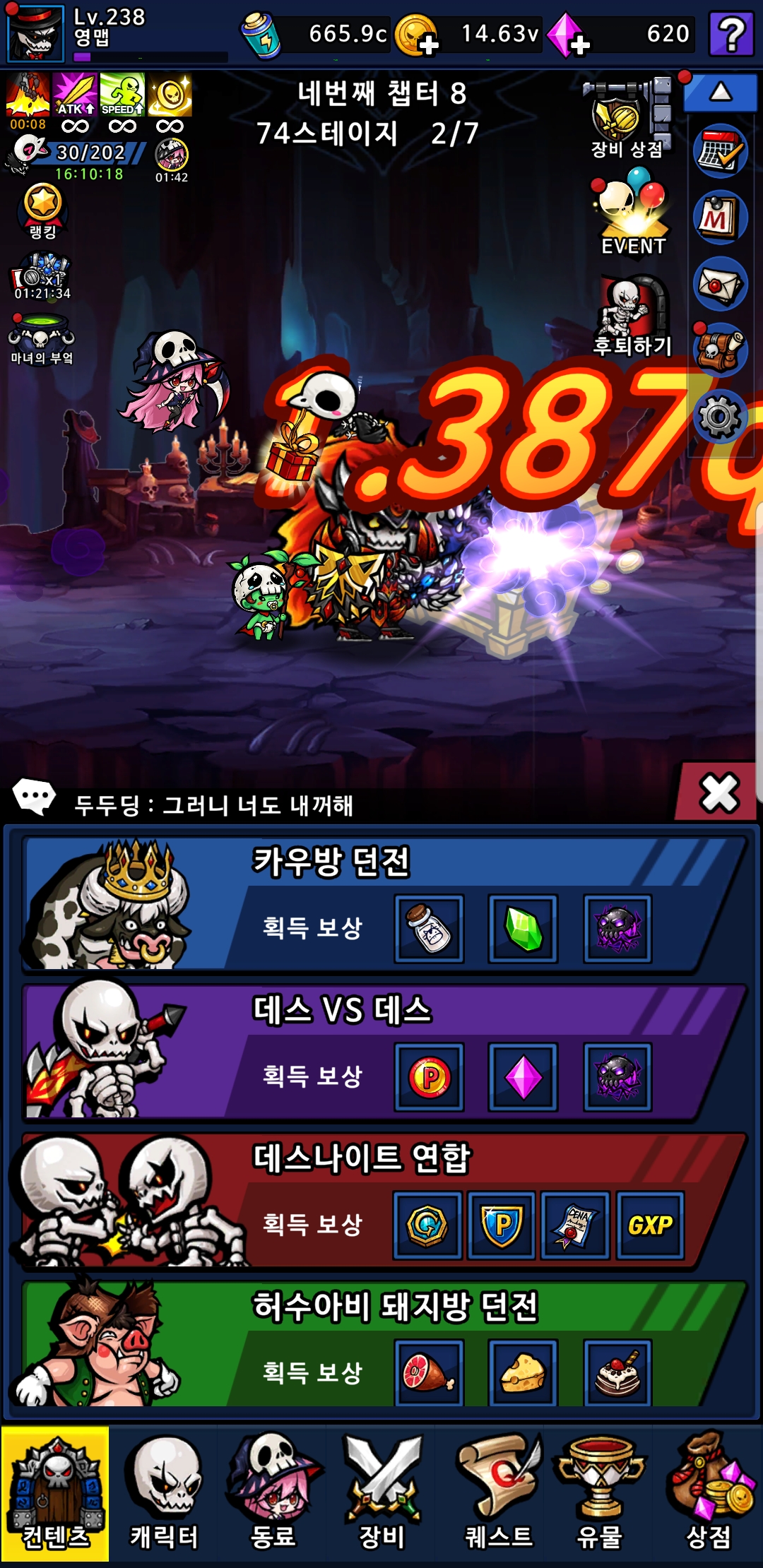 상단은 게임 화면 하단은 각종 레벨업 메뉴와 콘텐츠가 위치해있다.
