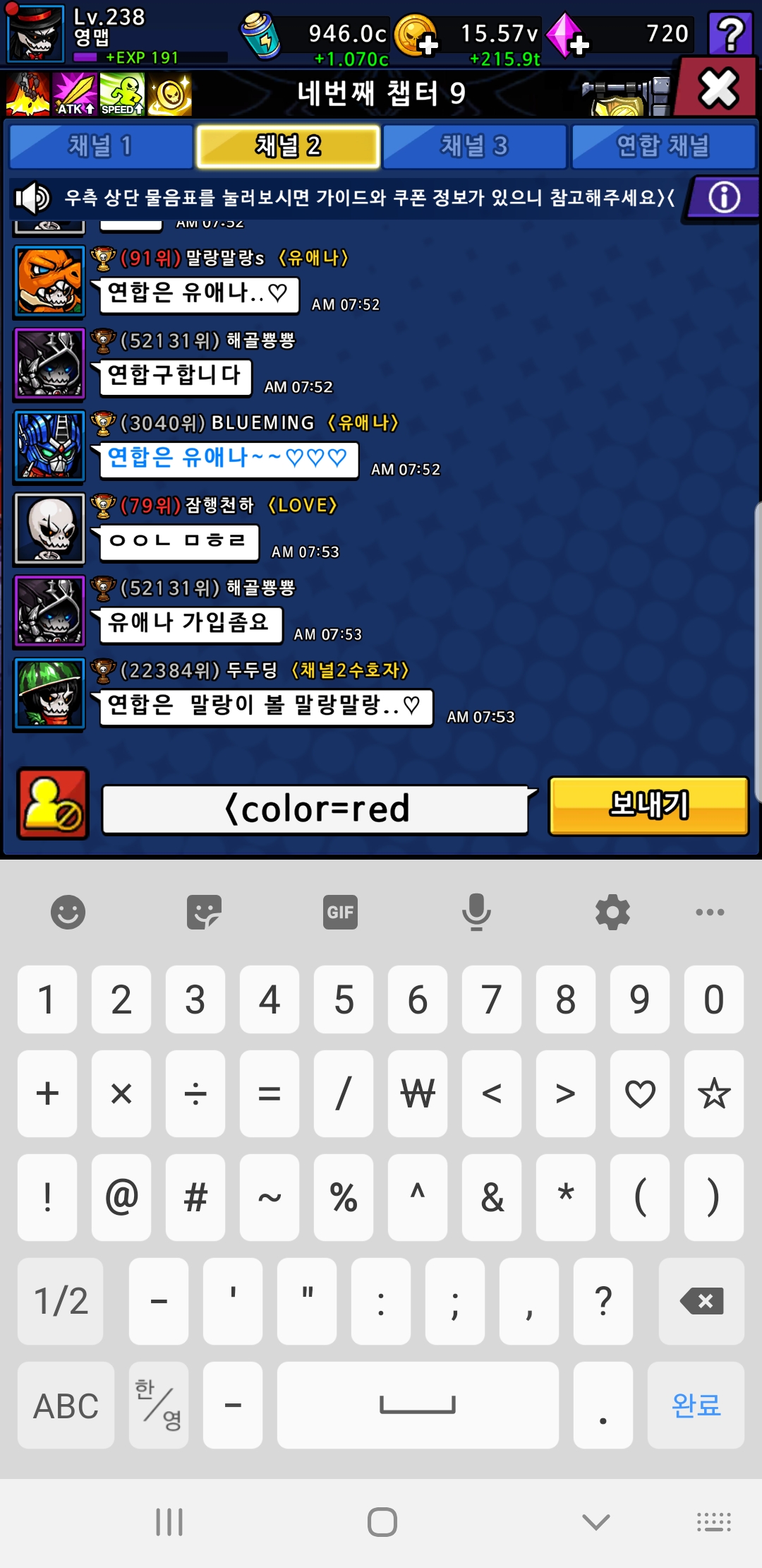 채팅 색상은 <color=red> 또는 원하는 색상 코드를 입력하고 글자를 입력하면 바뀐다.