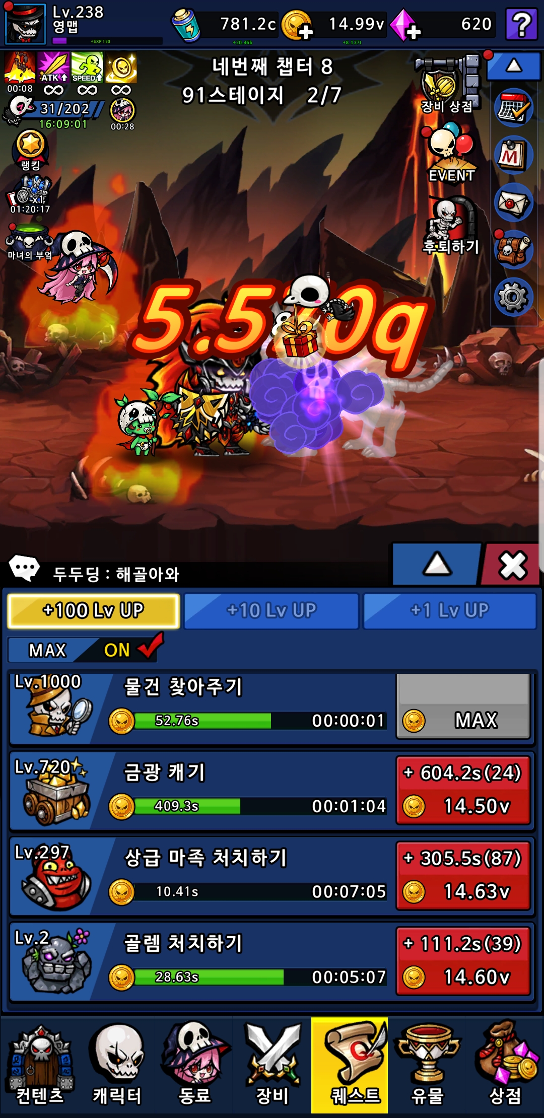 퀘스트는 자동적으로 골드를 버는 콘텐츠다. 레벨업을 할수록 골드가 점점 많이 쌓인다.