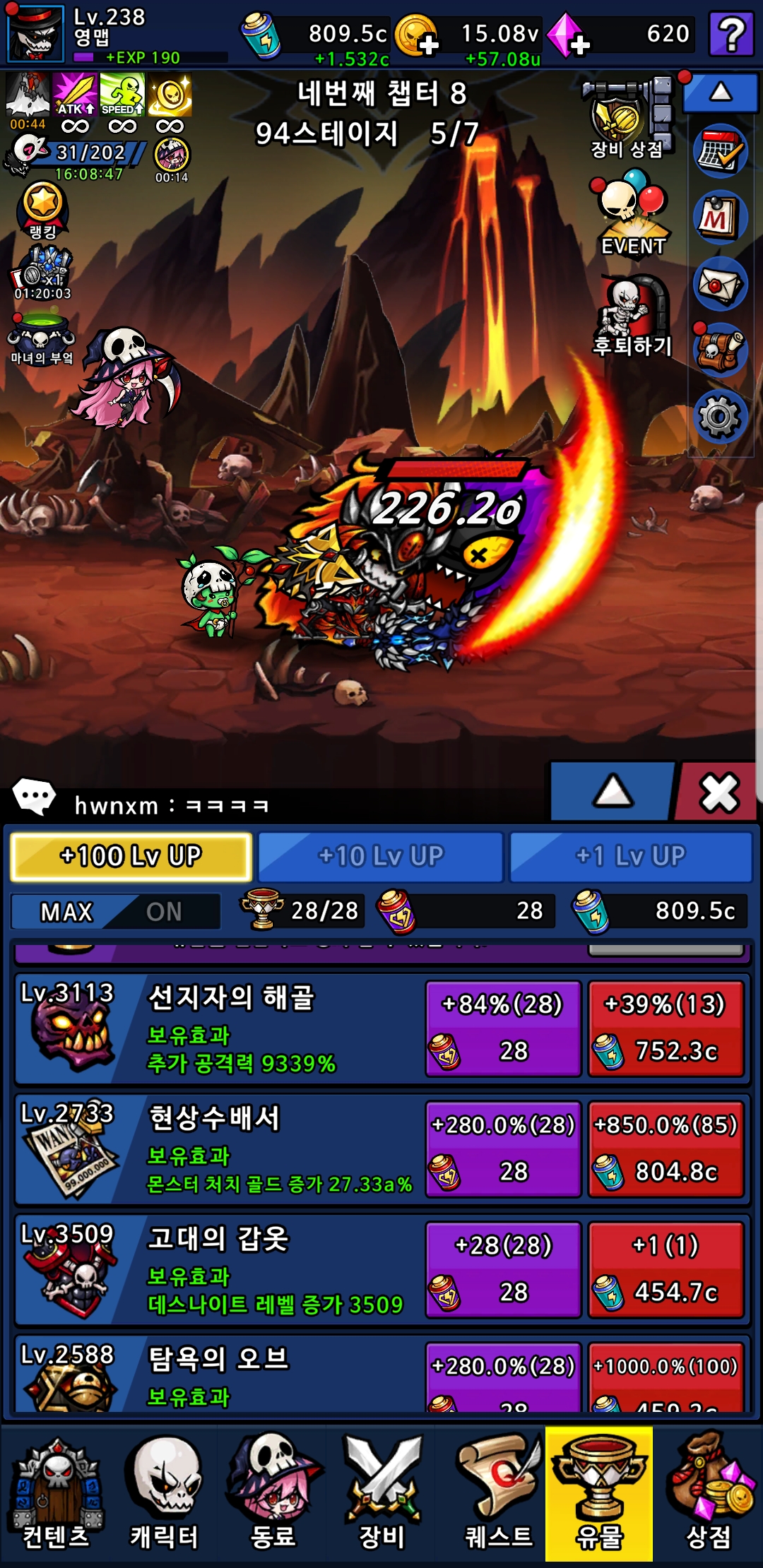 가장 최우선 적으로 모아야 할 것이 유물이다. 유물은 총 28개가 있으며 각각 멕스 레벨업이 다르다. 대부분 방치형 게임과 유사하므로 자세한 설명은 생략한다.