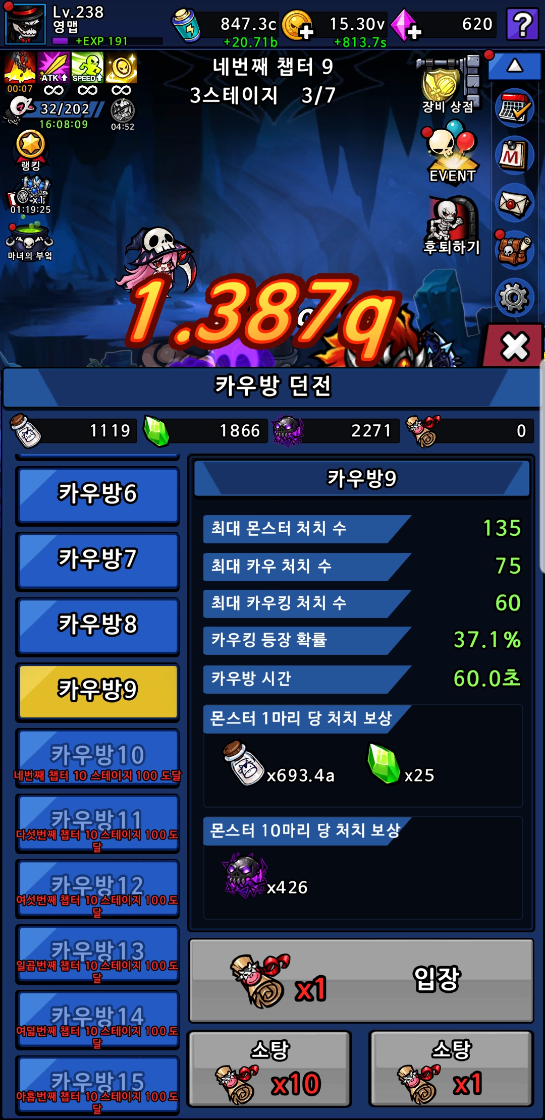 하루에 2개의 카우방 입장 티켓을 주는데 여기에서 데스나이트 강화와 펫 강화에 필요한 우유와 강화 구슬을 얻을 수 있다. 카우방은 시간제한이 있어 몬스터당 한방 컷 이 가능할 때 들어가는 것을 추천한다.
