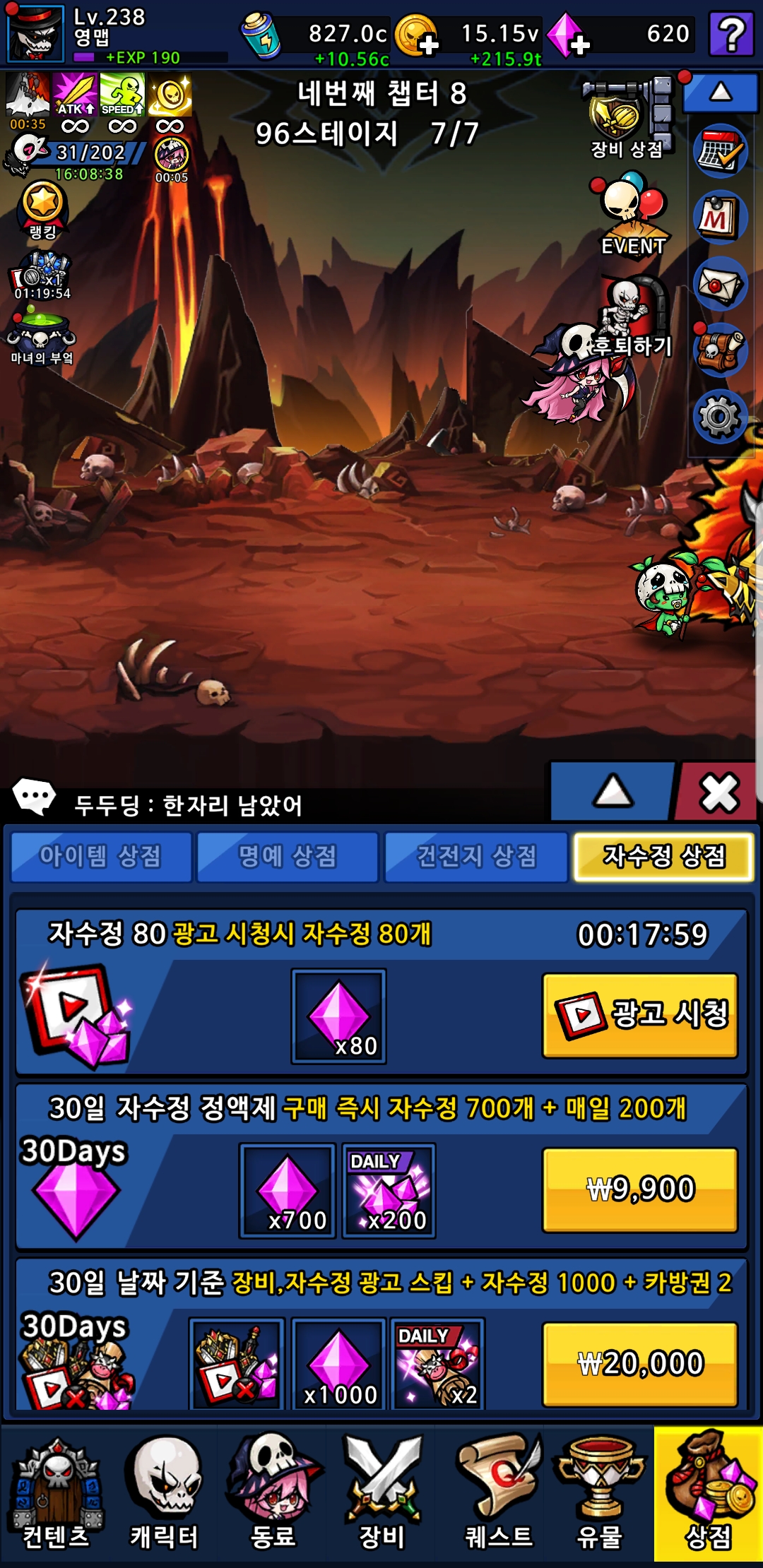 역시나 광고를 보면 자수정을 준다. 가끔 날아오는 해골 새를 잡을 때 2배 보상을 받으려면 광고를 봐야 한다.