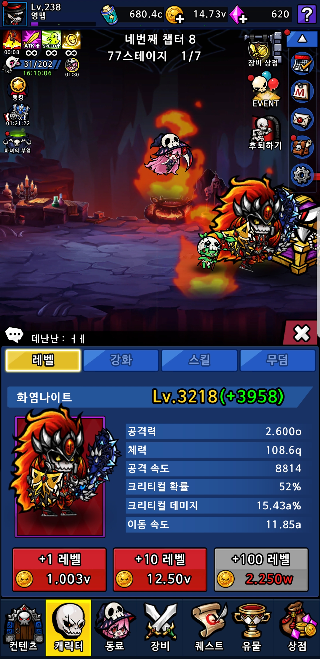 데스나이트 레벨업은 편의성을 위해 +1 +10 +100 단위로 증가시킬 수 있고 몬스터를 처치해서 얻은 골드가 필요하다.