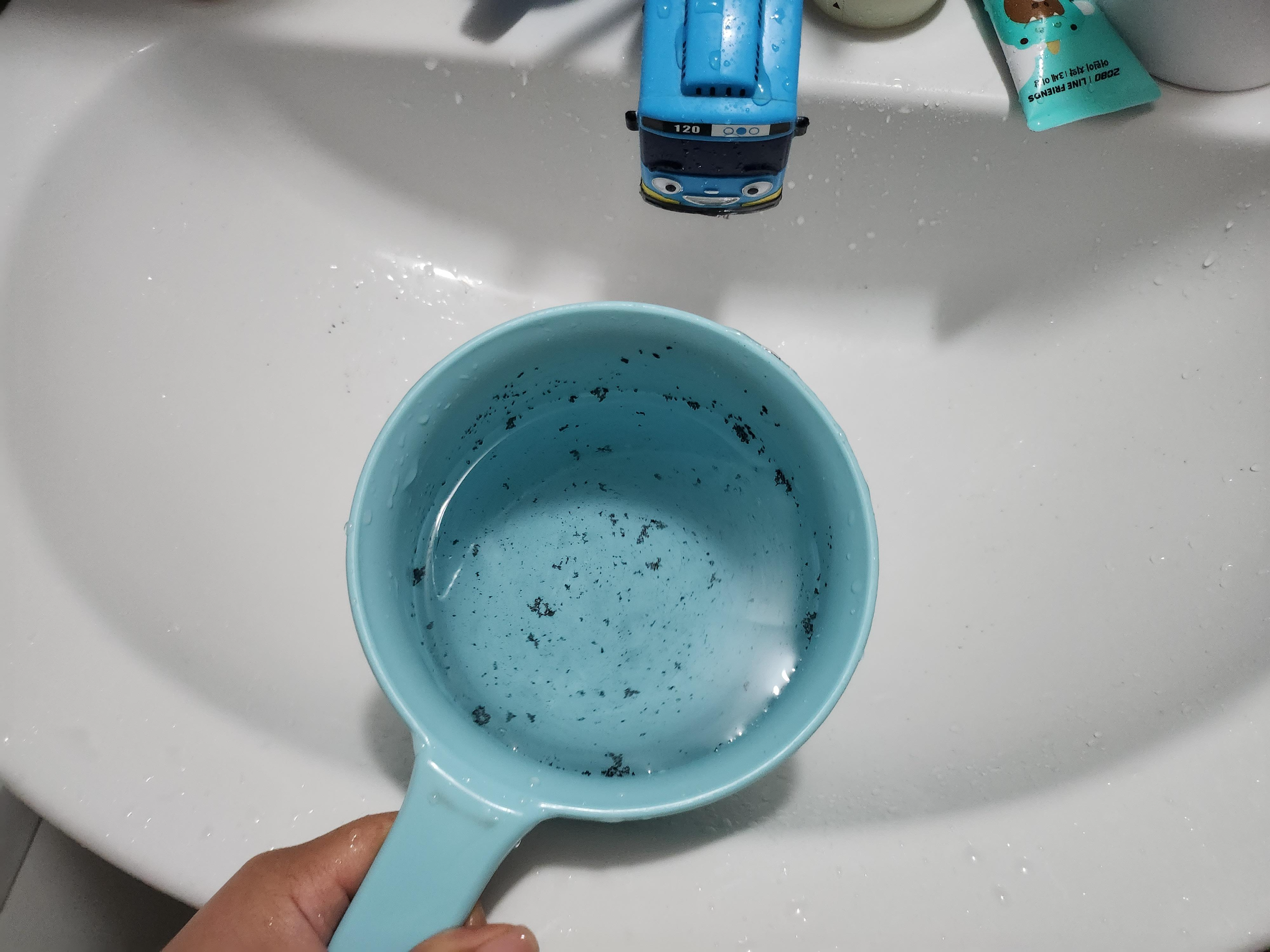 심지어 화장실 세면대에서도 검은색 이물질이 나오기 시작했습니다.