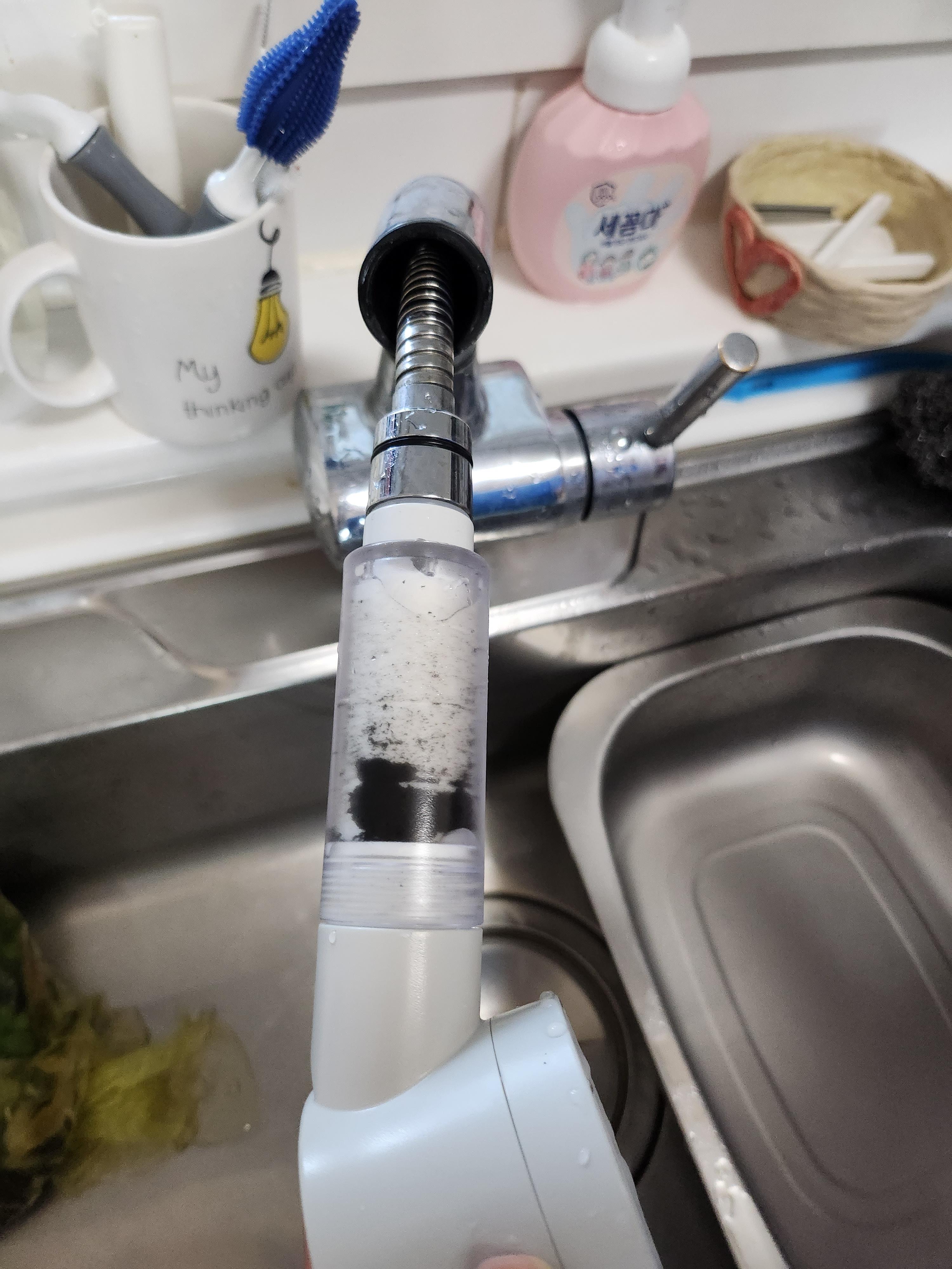 싱크대에서 온수를 틀면 검은색 이물질이 나옵니다. 매번 나오는 것은 아니고 한 달에 한번 정도 갑자기 많이 나오는 것 같아요. 필터가 포함된 수전 헤드를 구매하고 며칠 사용한 후기입니다.