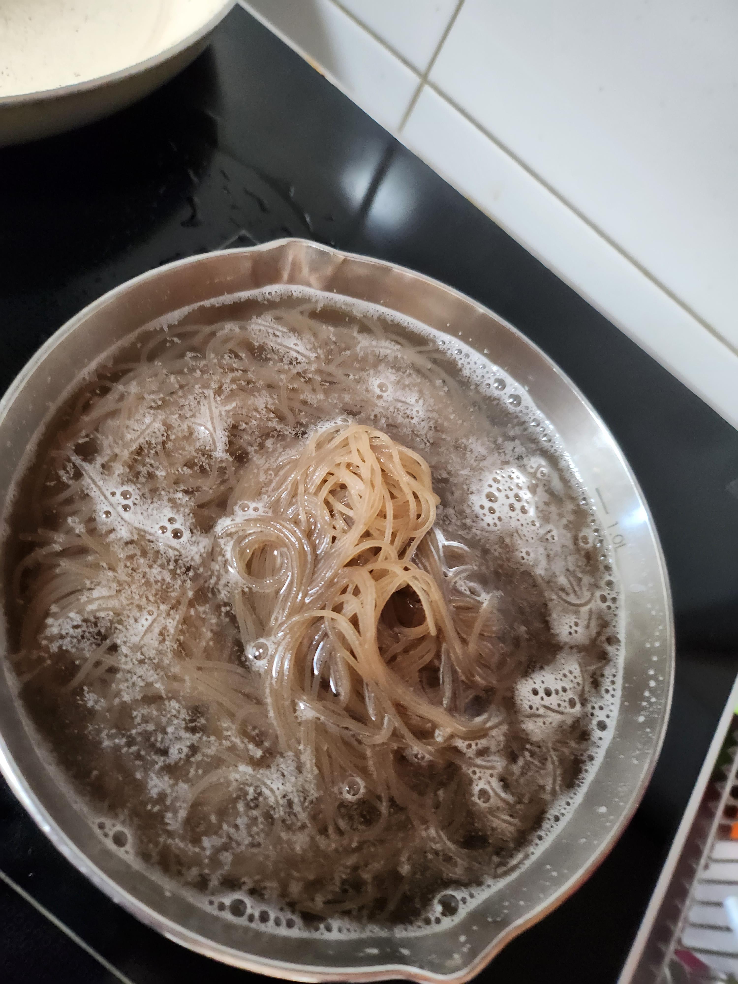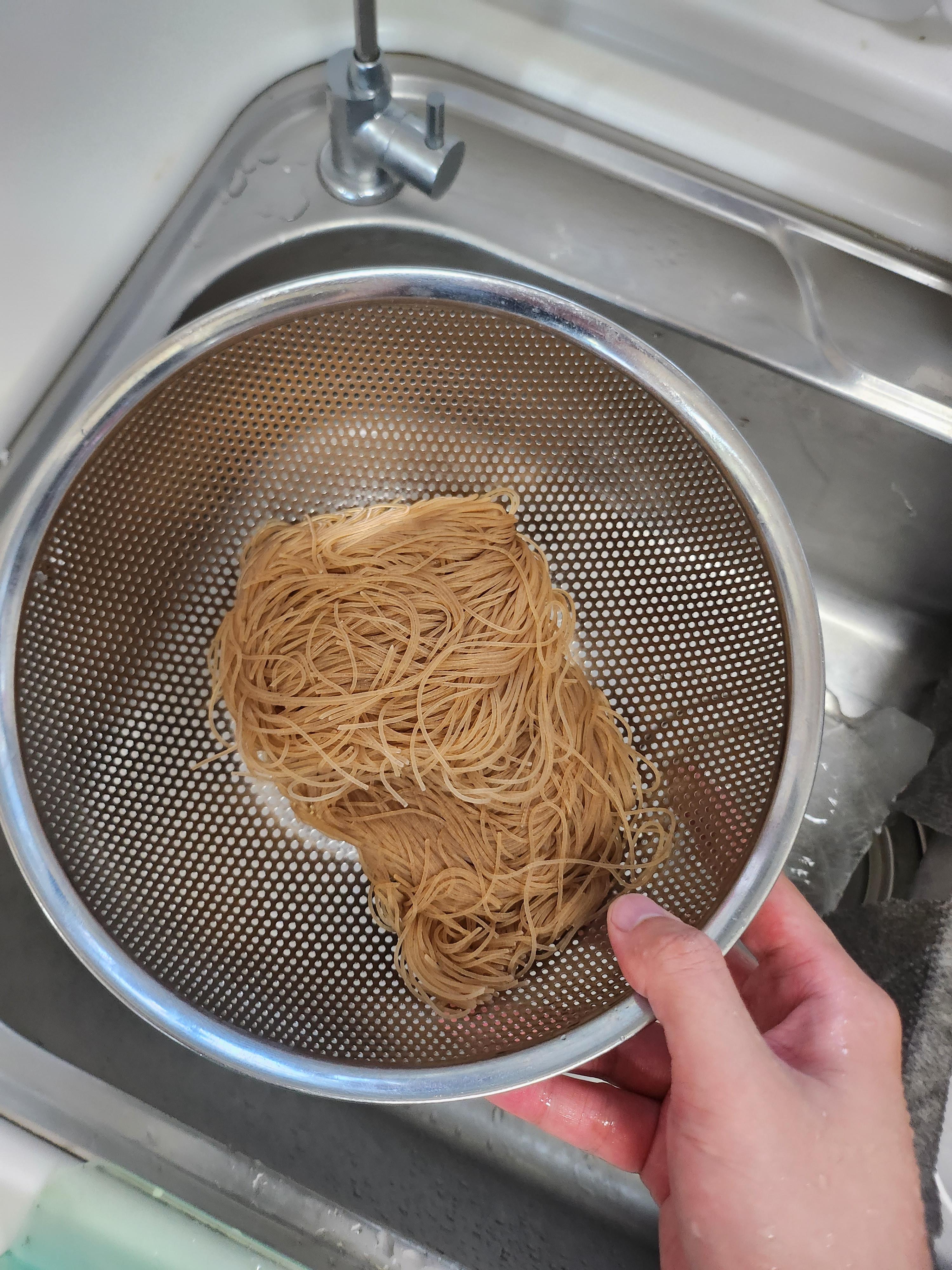 익히면서 한가닥 잡아 찬물이 담긴 앞접시에 헹구고 먹어보시면 면 삶는 적절한 타이밍을 찾을 수 있습니다.