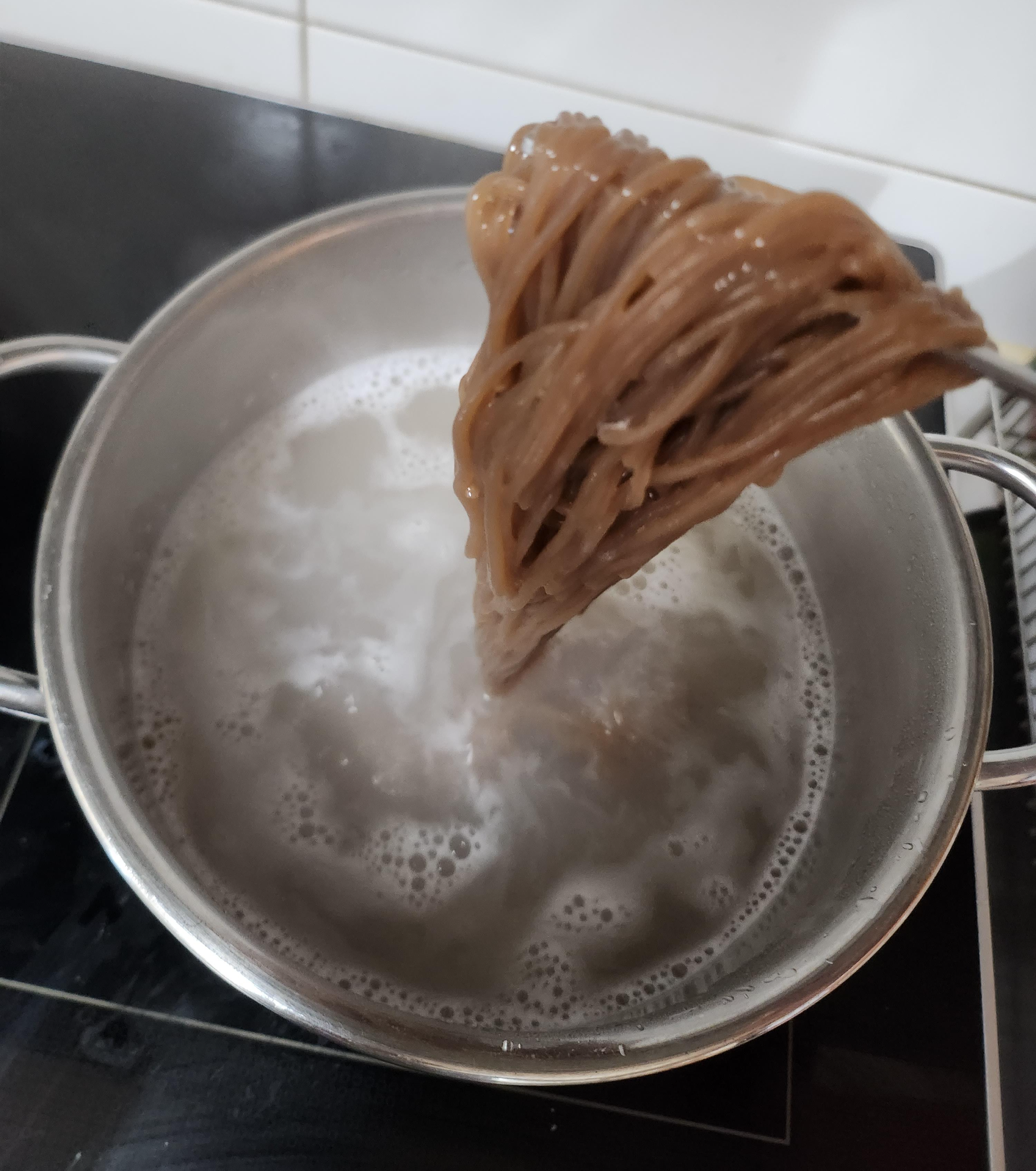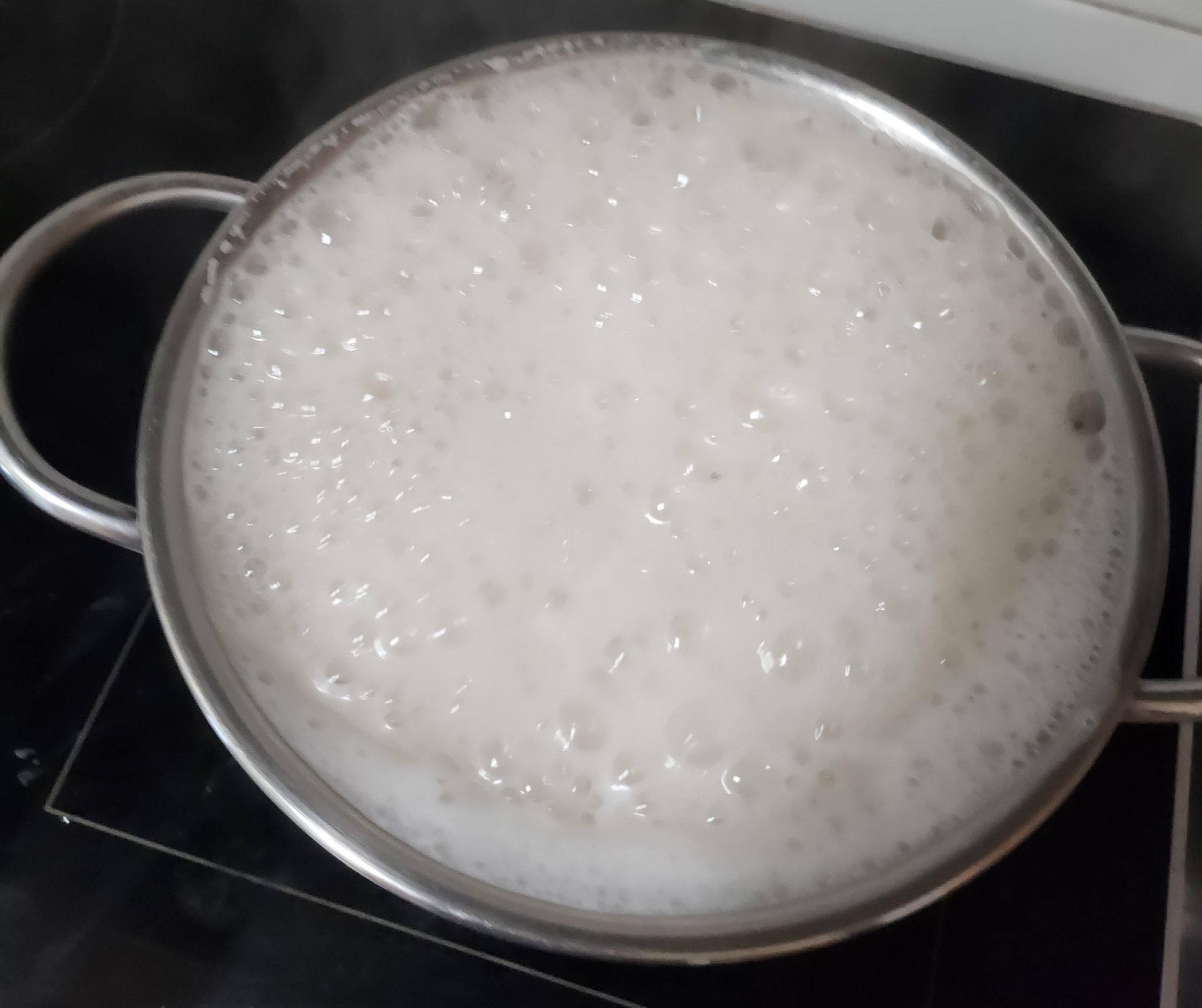거품이 생기면 넘치지 않도록 찬물을 조금 넣거나 입바람으로 후후 불어주세요.