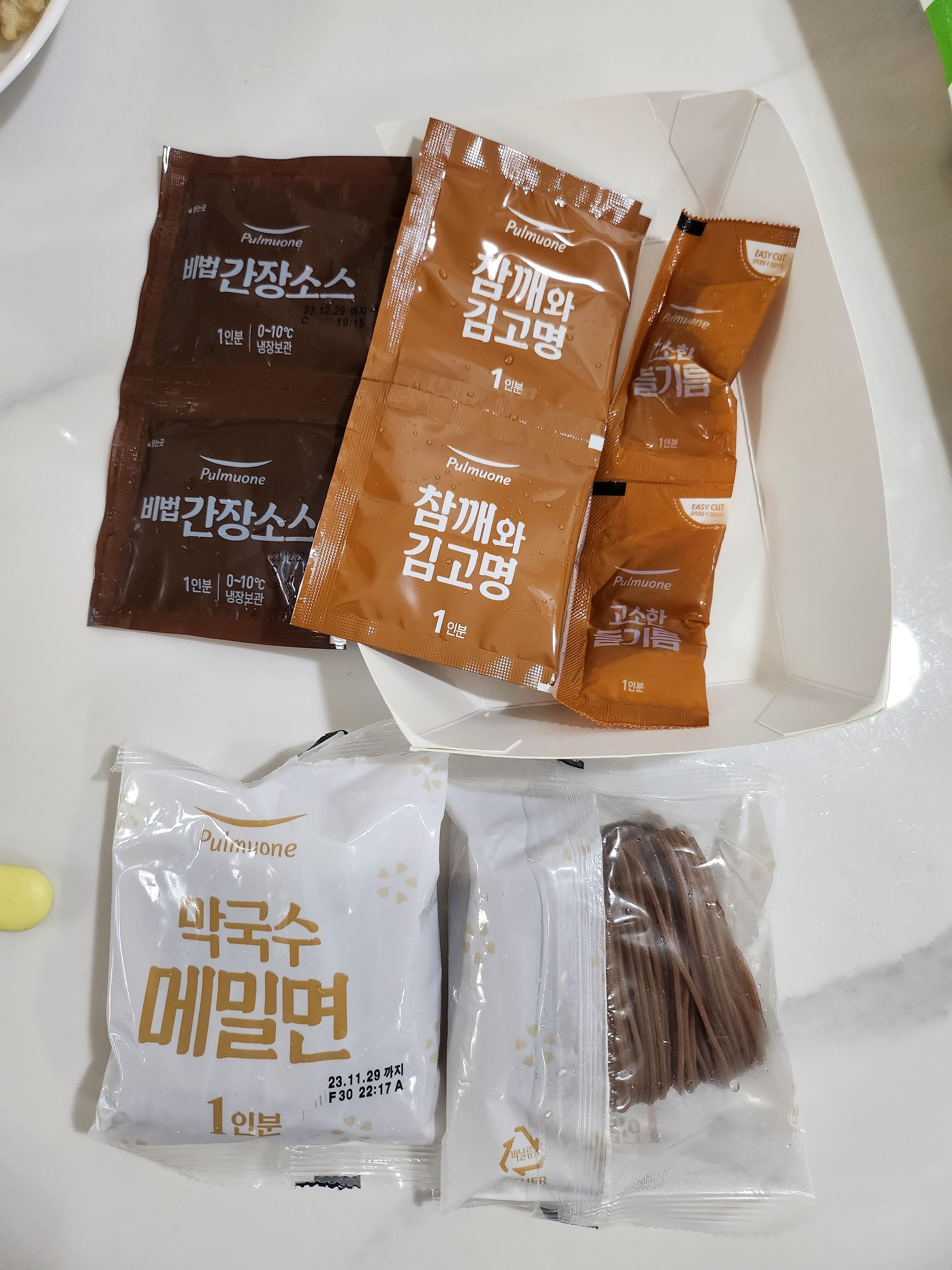 간장소스, 참깨와 김 고명, 들기름, 메밀면이 2개씩 들어있습니다.