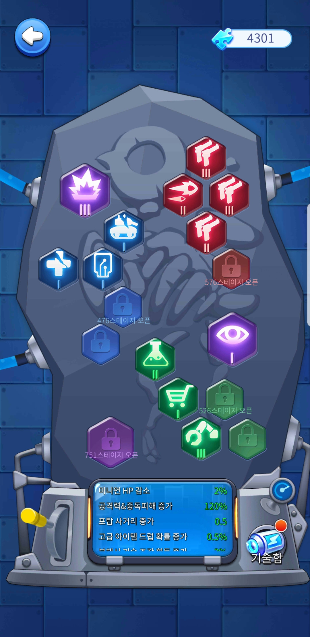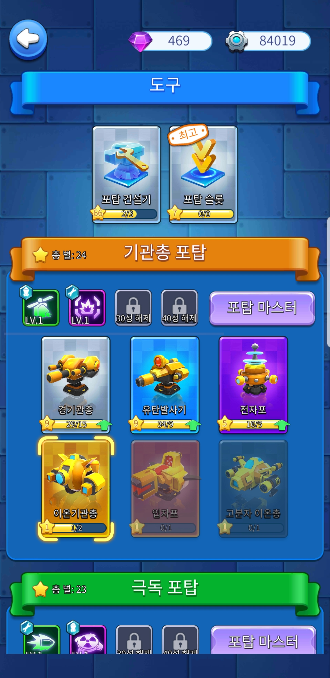 4종류의 포탑에 각각 6단계까지 업그레이드 한다. 포탑 건설기를 업그레이드하면 최총 생성되는 포탑의 레벨이 상승한다.