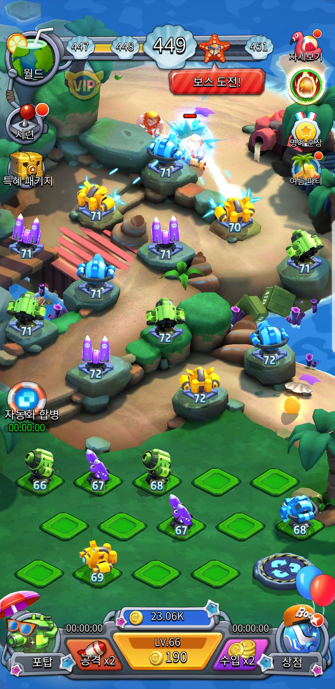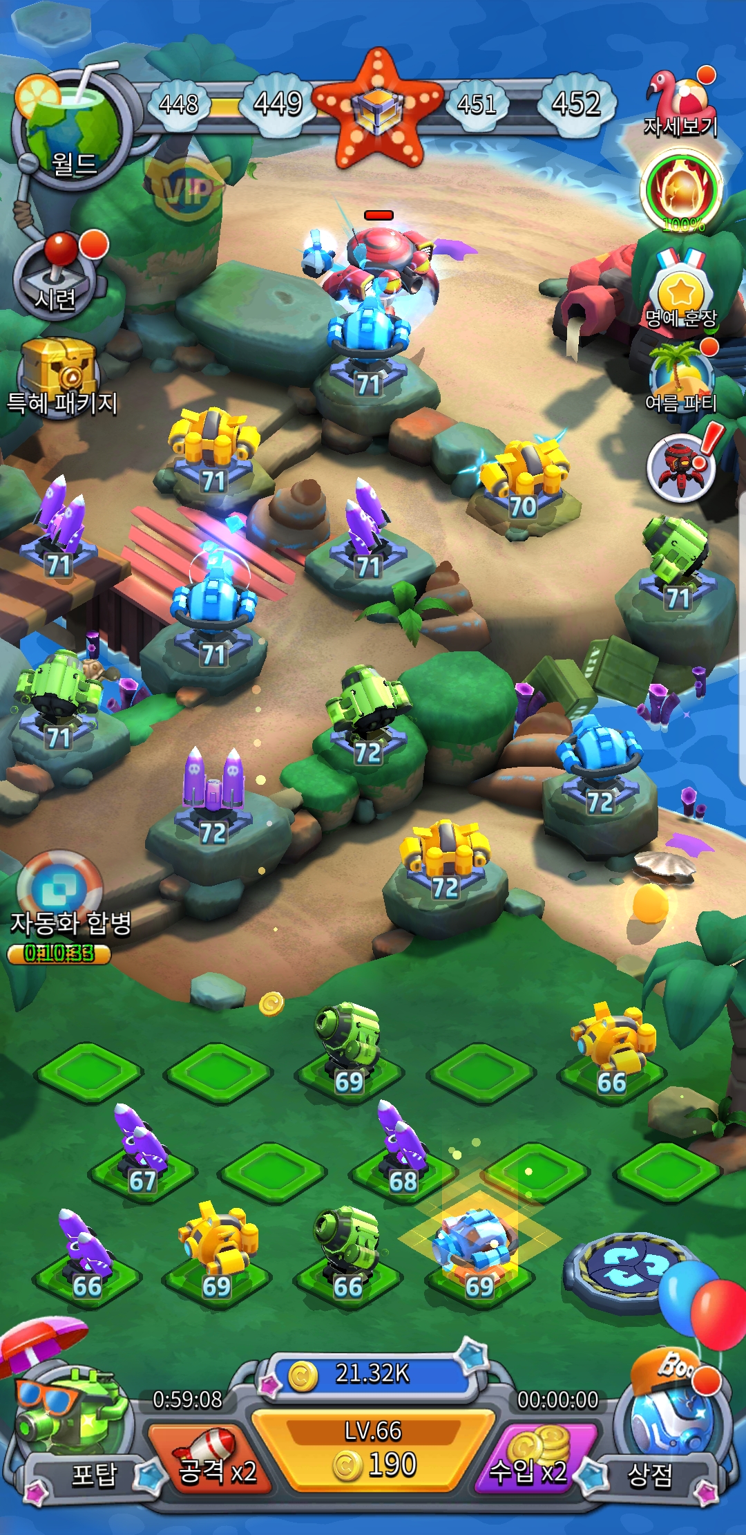 게임화면이다. 상단은 디펜스화면 하단은 포탑을 머지하는 화면이다. 포탑은 4종류만 있어서 전략적인 배치가 필요하지 않다. 골고루 배치하는게 좋은 것 같다.