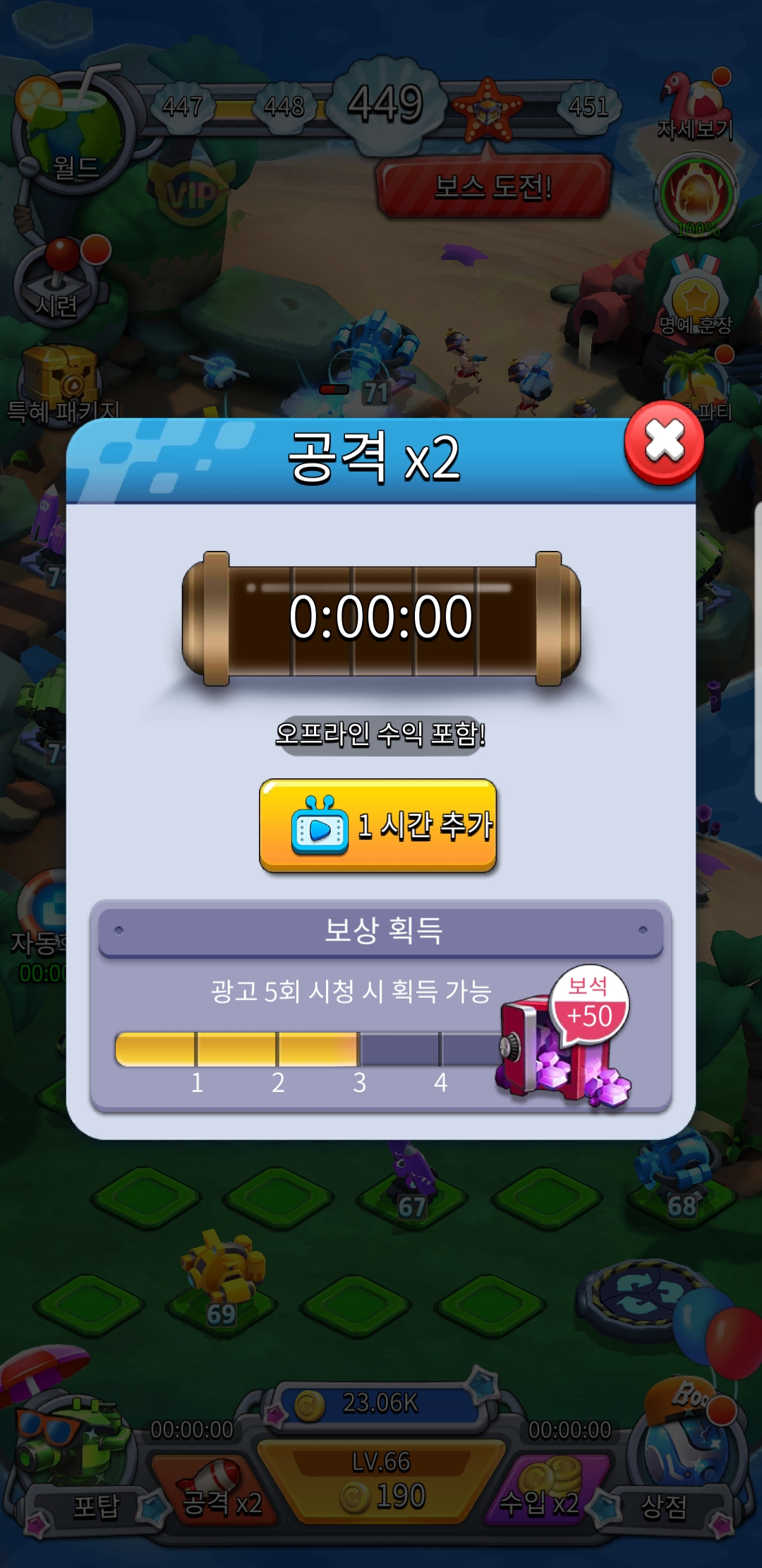 광고를 보면 공격 버프를 1시간 동안 준다. 클리어 하는 기준이 항상 ×2이다보니 광고는 필수다.