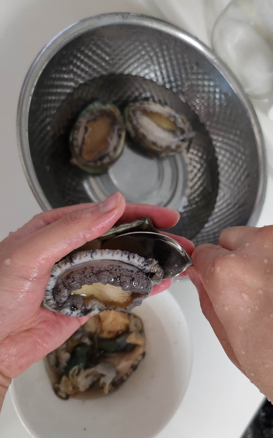 전복의 이빨이 있는 쪽부터 숟가락을 넣고 지렛대처럼 들어줍니다.