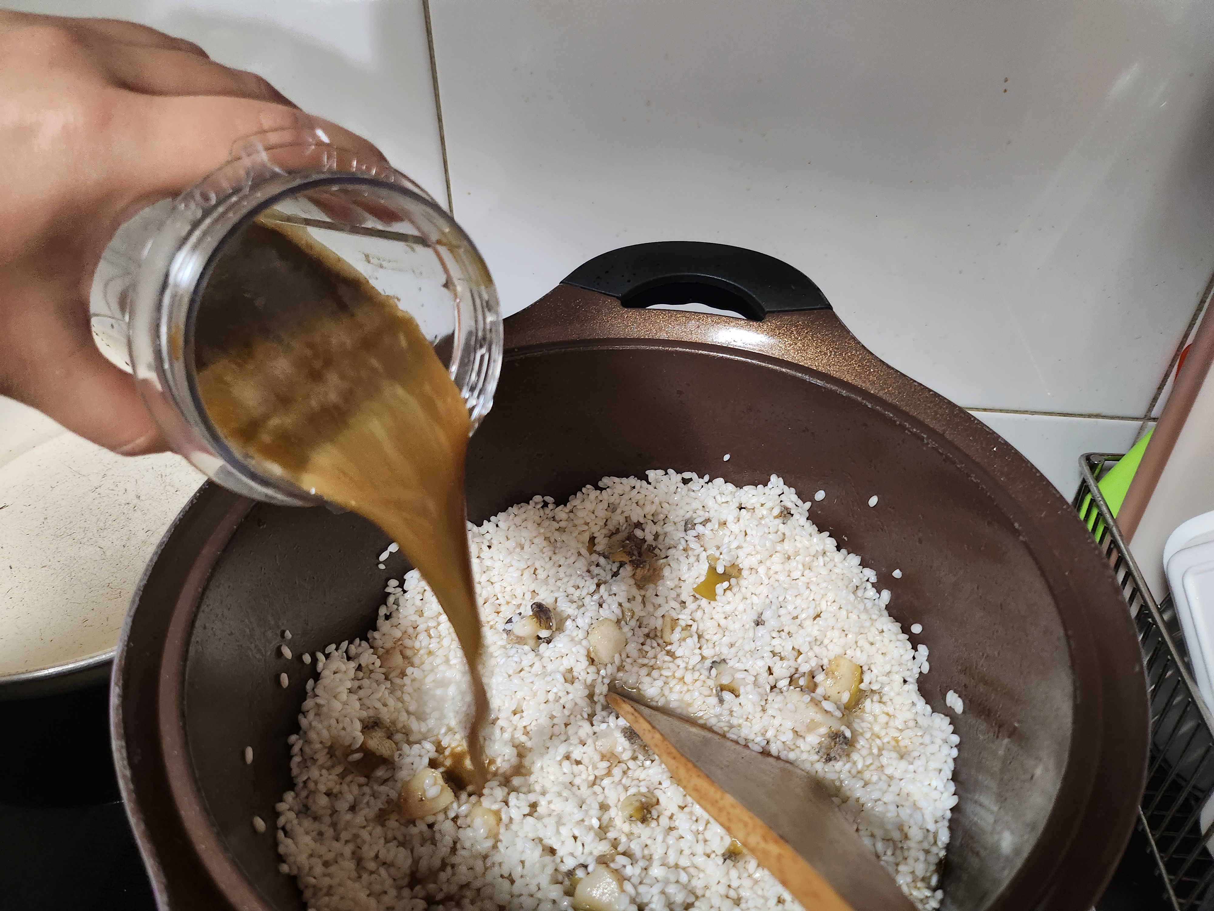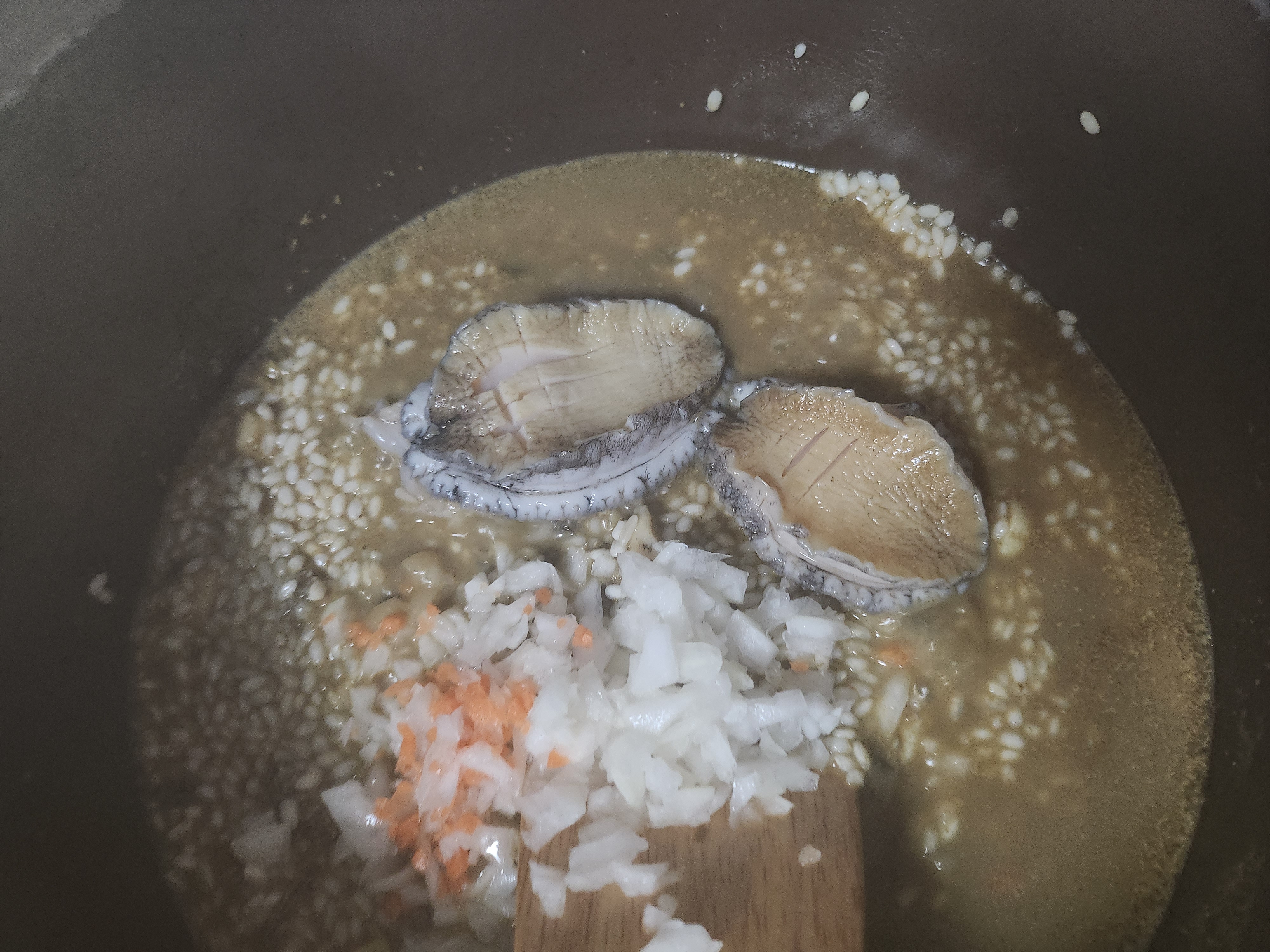 7. 미리 불려놓은 쌀(4컵-3인분)과 전복 내장을 넣고 끓입니다.