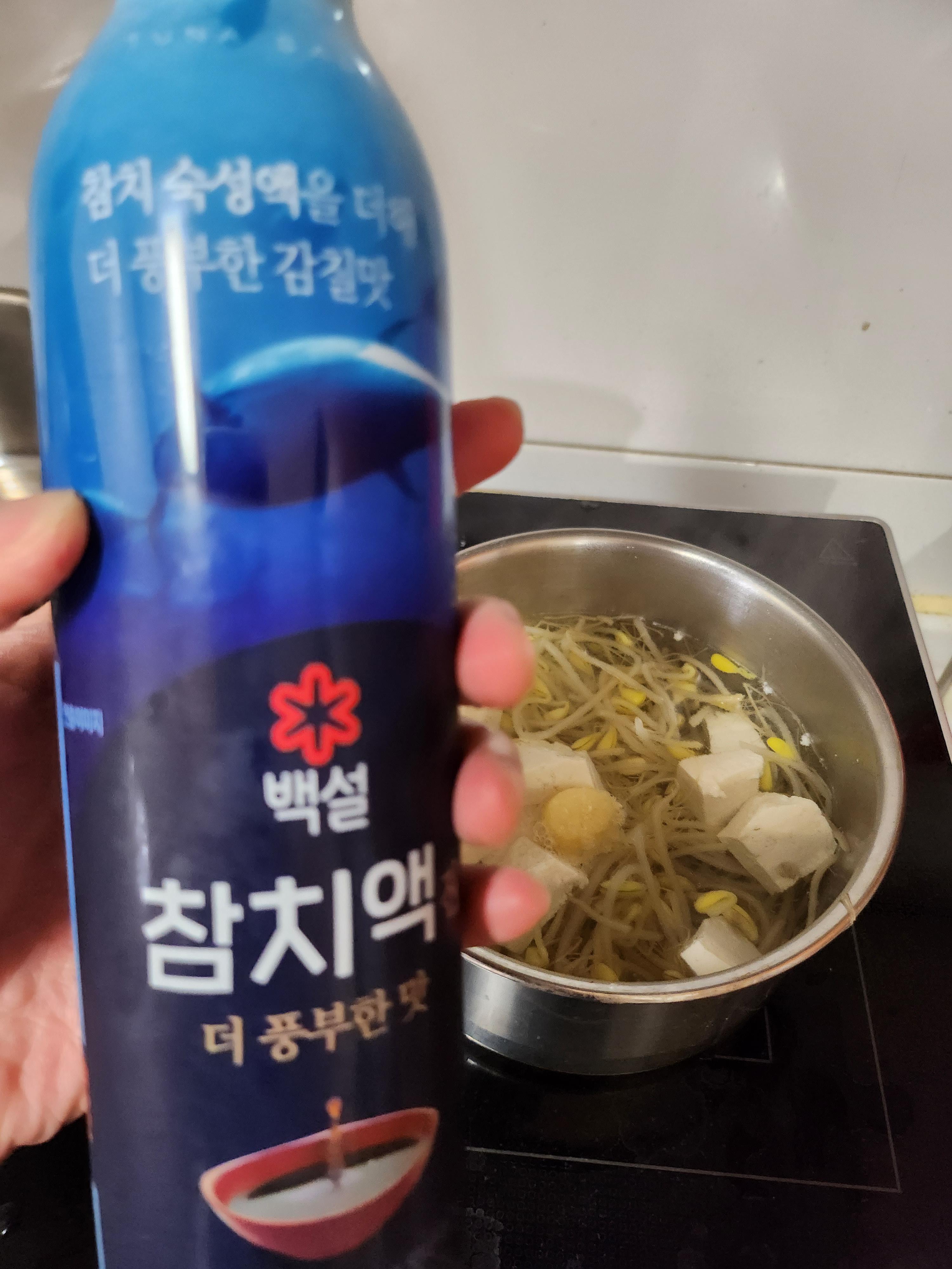 끓이면서 간을 봅니다. 간장 한 스푼, 참치액 한 스푼을 넣습니다.