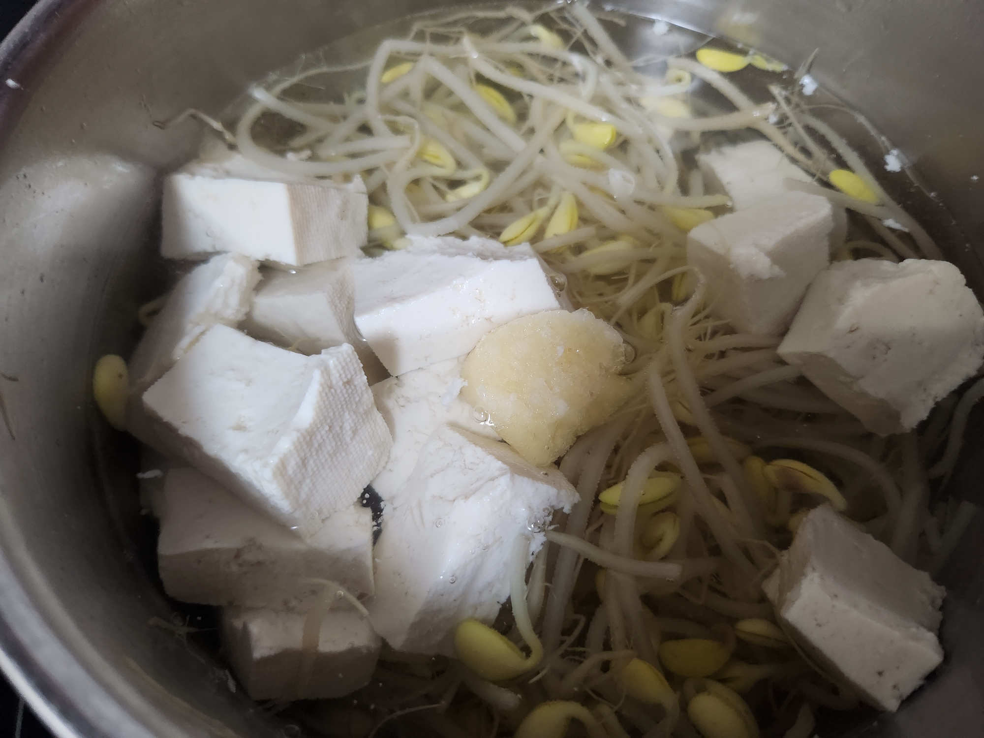 그리고 콩나물과 두부와 다진 마늘을 넣습니다.