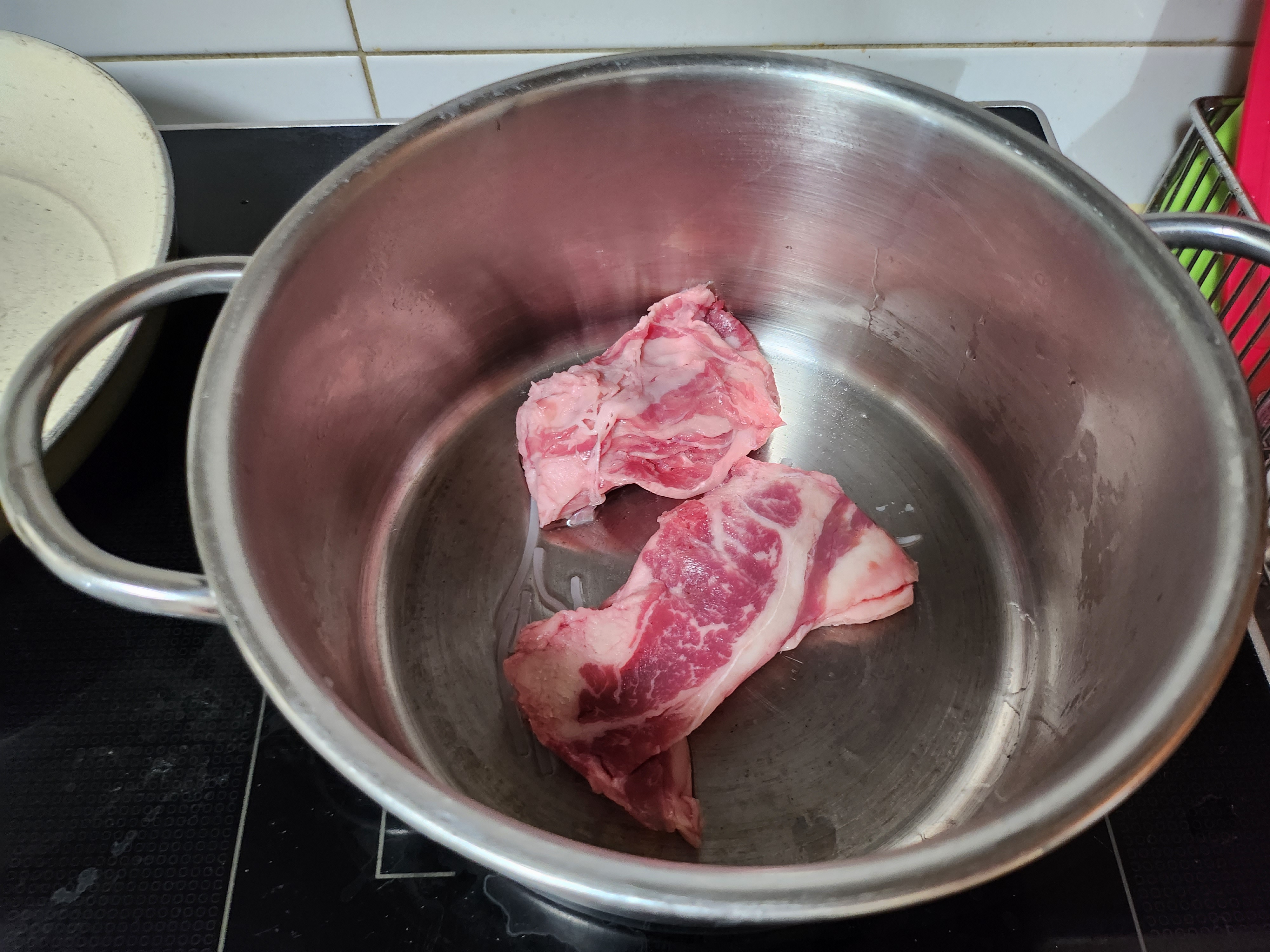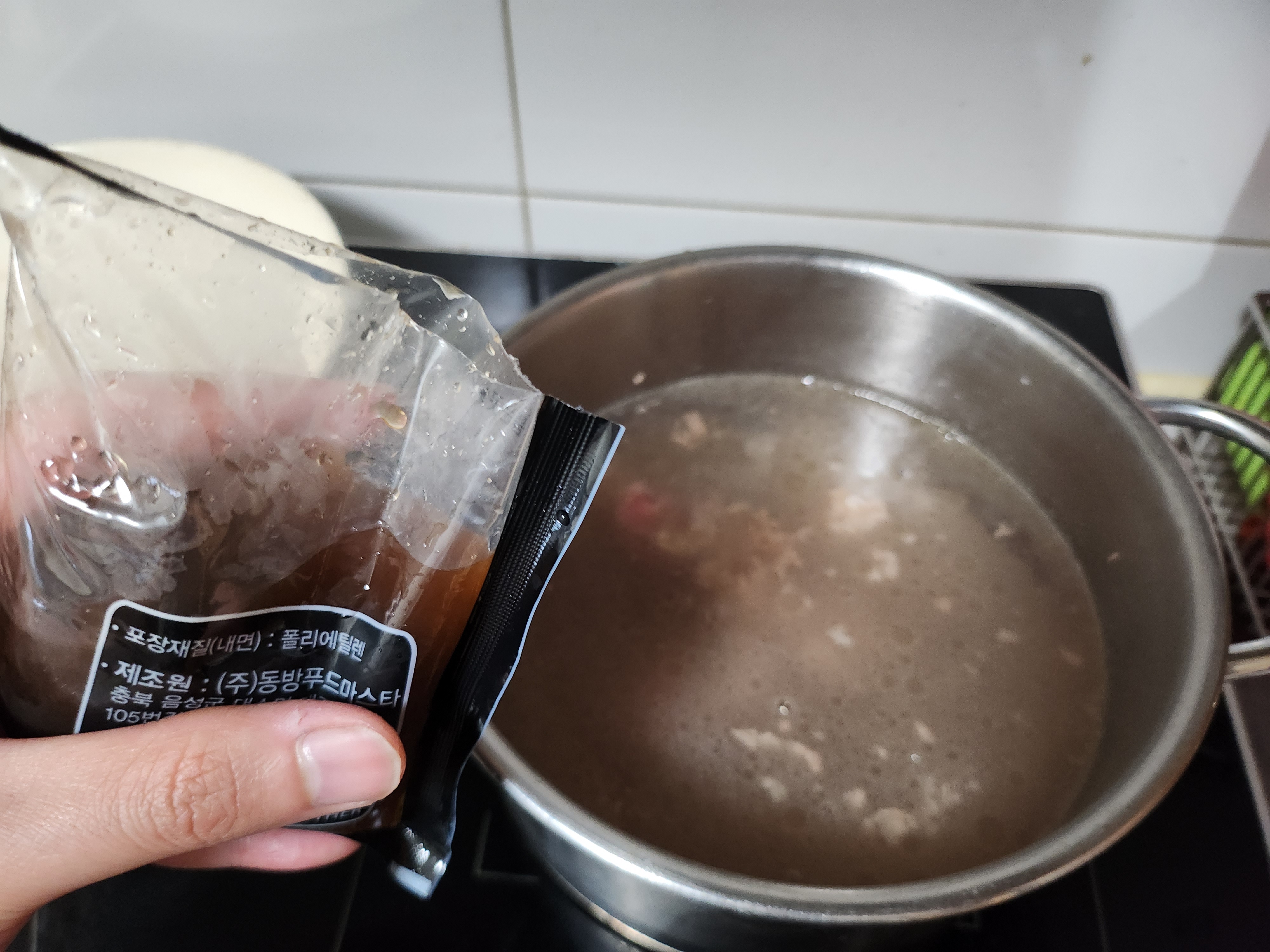 4. 고기를 익힌 냄비에 물을 1000ml정도에 육수를 넣고 5분 끓입니다.