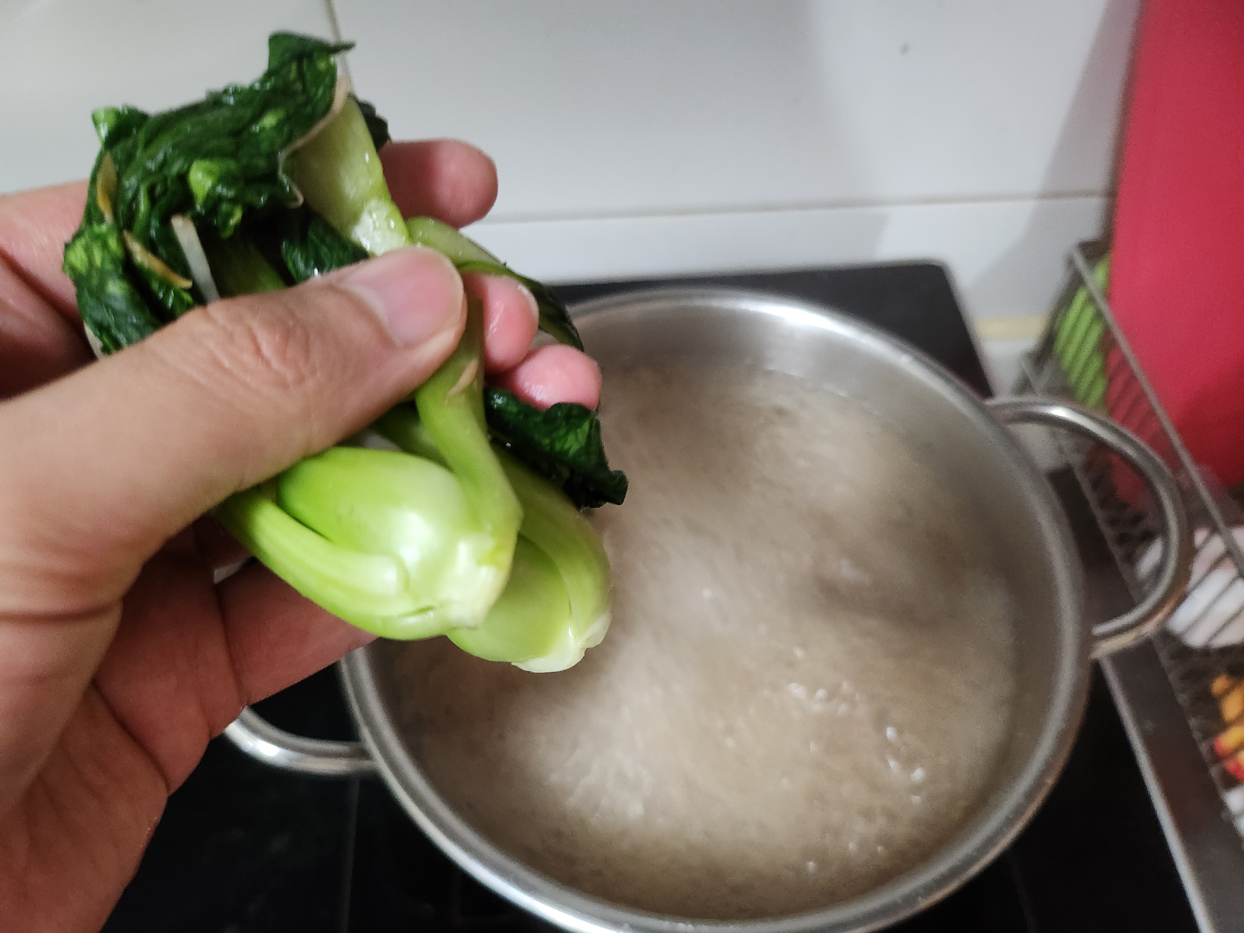 5. 마지막 불을 끄기전에 청경채를 넣고 10초 정도 데칩니다.