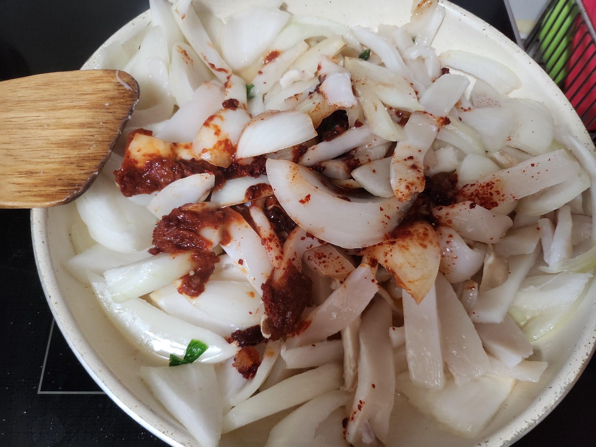 5. 재료가 살짝 익으면 준비한 양념장을 넣고 볶습니다.