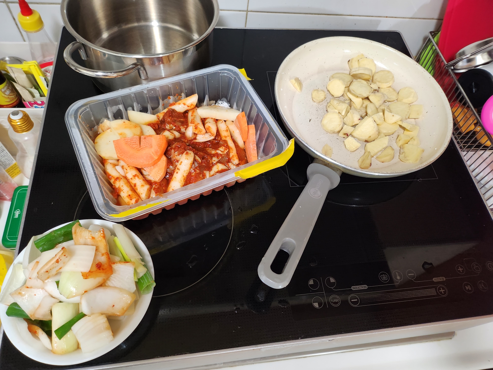 물을 150ml 정도 추가해서 볶다가 떡이 말랑해질즈음 양파와 대파를 넣었습니다.
