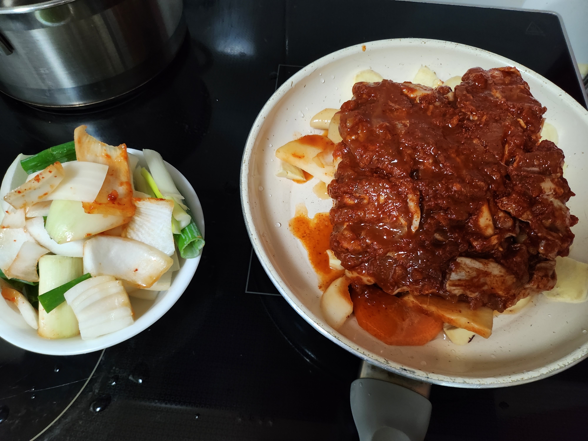 레시피는 따로 없고 그냥 평소 닭볶음탕을 만드는 순서대로 만들었습니다.