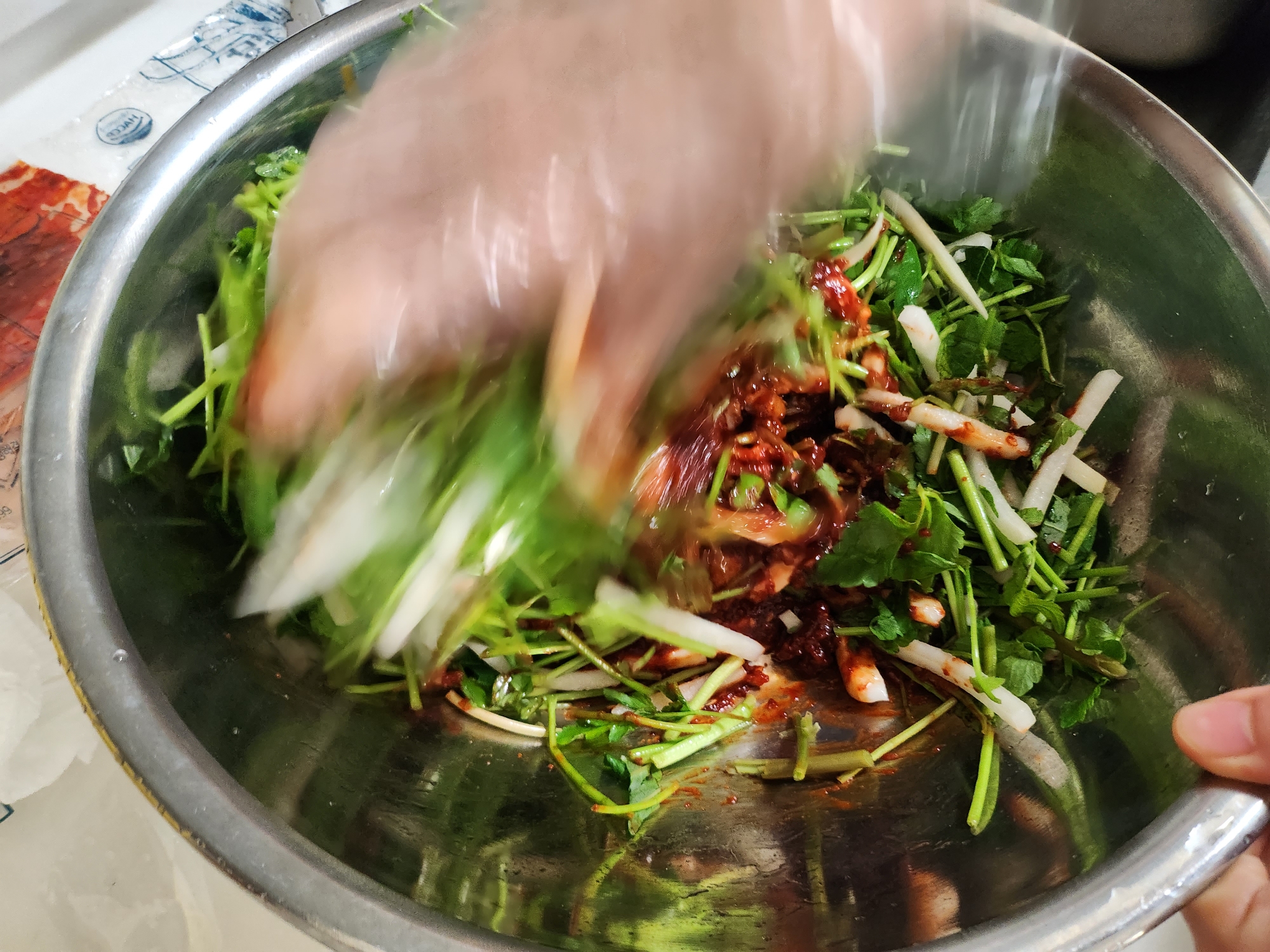 야채(미나리)도 잘 씻고 물기를 빼서 볼에 담습니다.