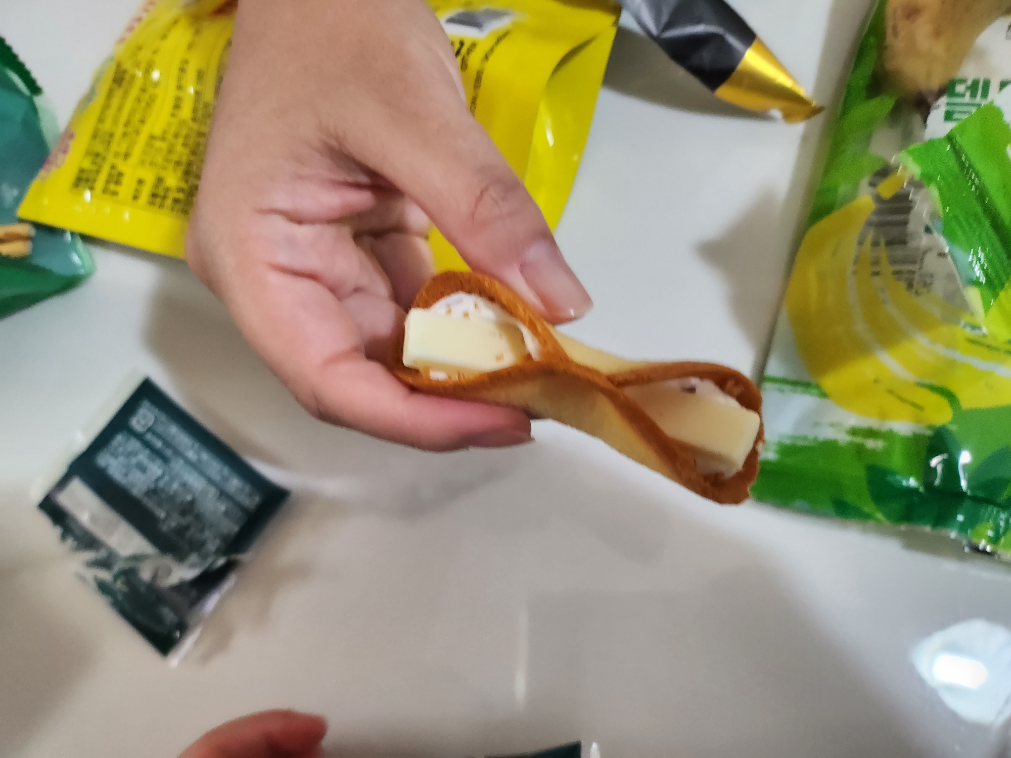 바삭한 쿠키 사이로 화이트 초콜릿이 들어있습니다.