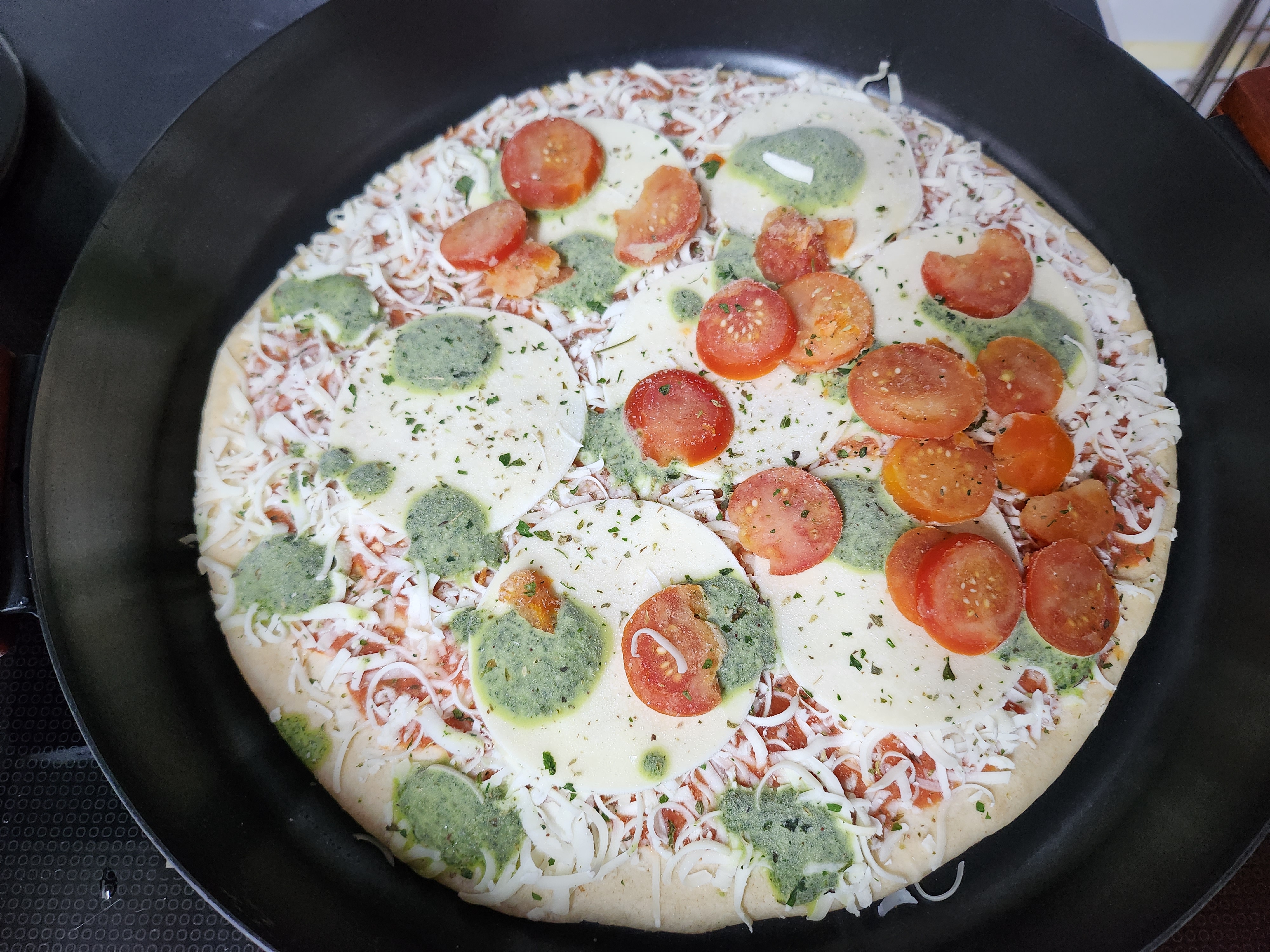 냉동상태의 피자를 올리고 피자 가장자리는 물을 살짝 적셔주어 촉촉하게 만듭니다.