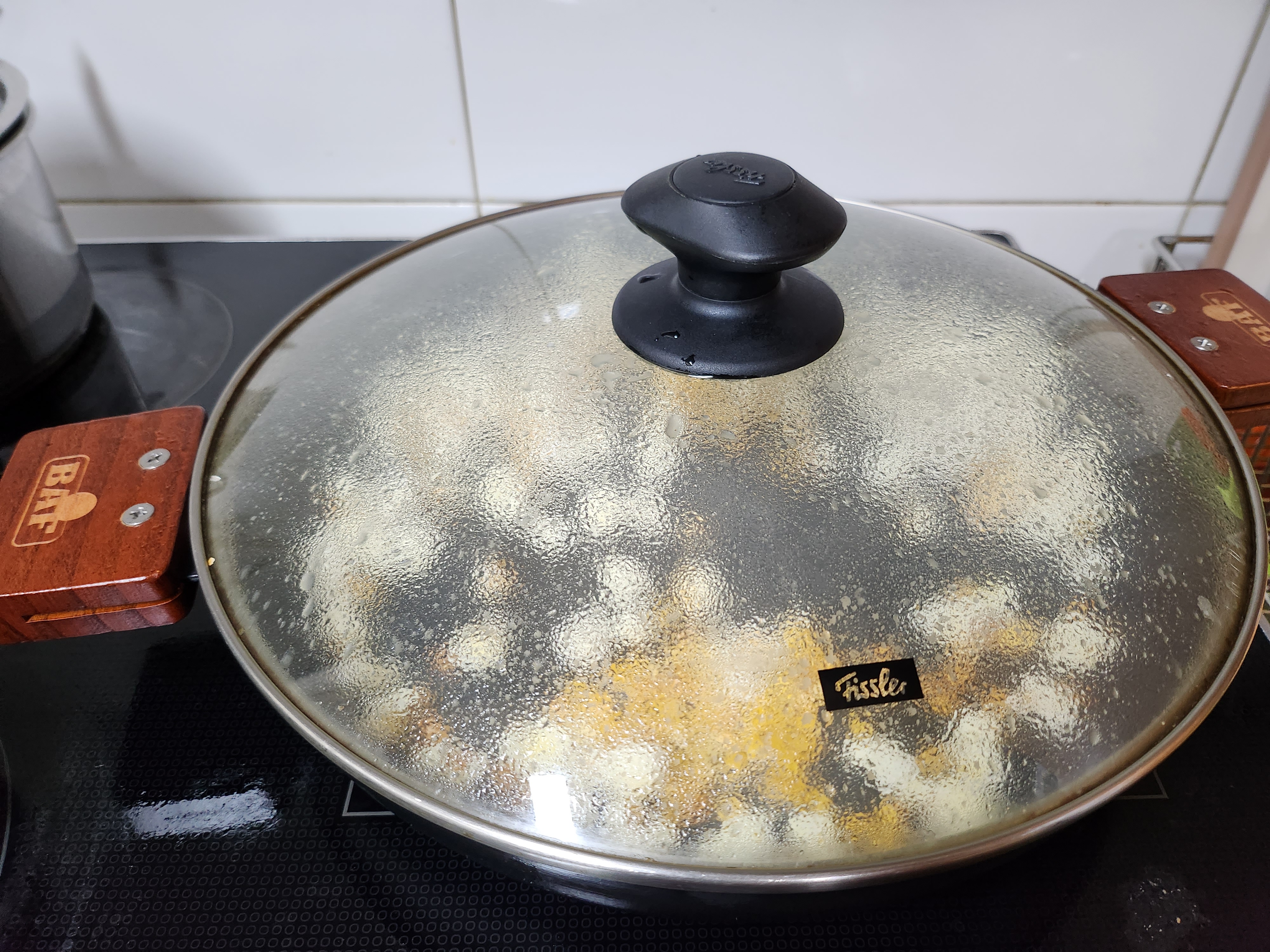 뚜껑을 덮고 후라이팬이 달궈지면 볶음밥 볶듯 흔들어주면 더 잘 튀겨집니다.
