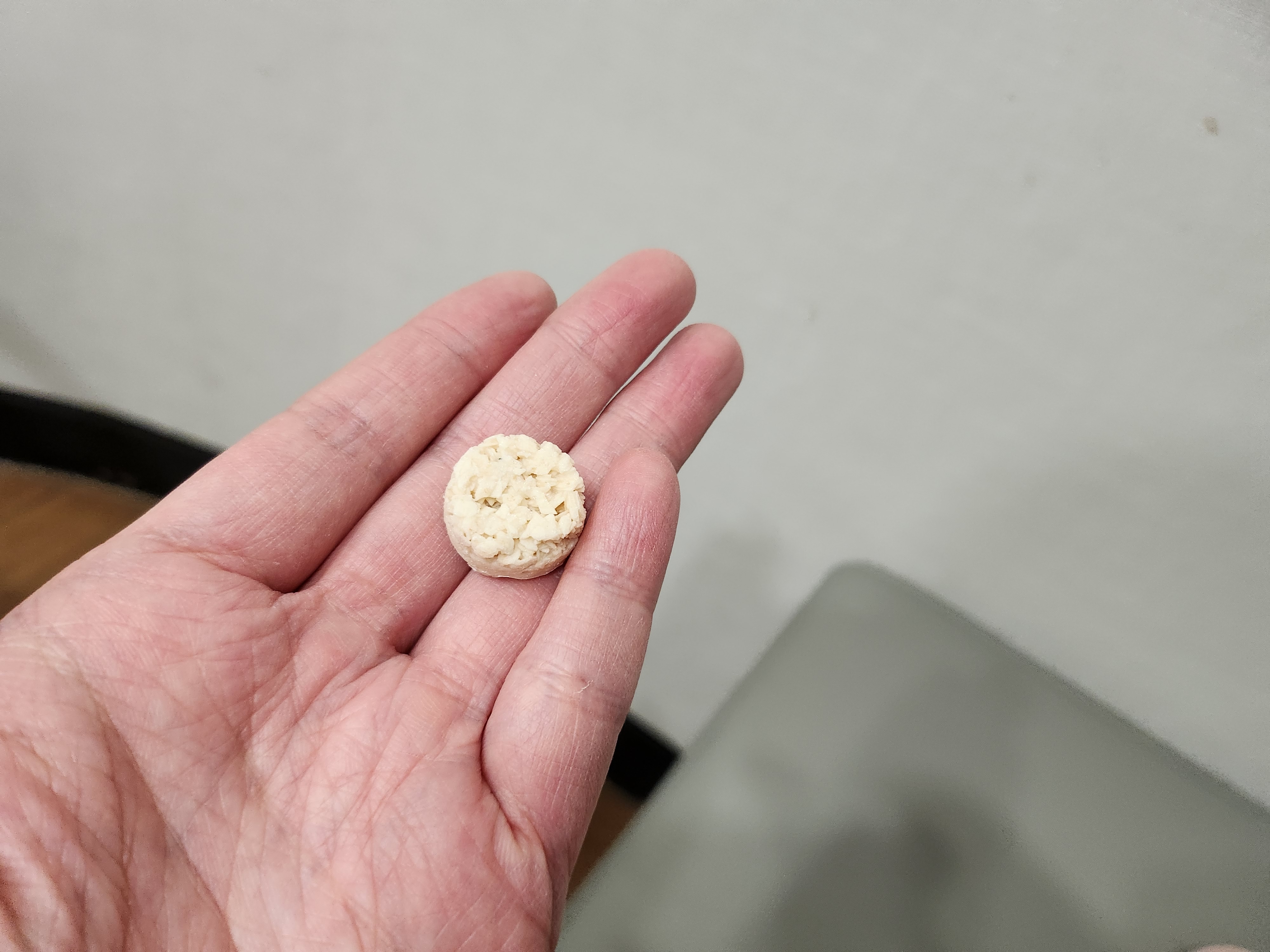 고소한 냄새가 나고 동그랗고 한입에 먹음직하게 생겼습니다.