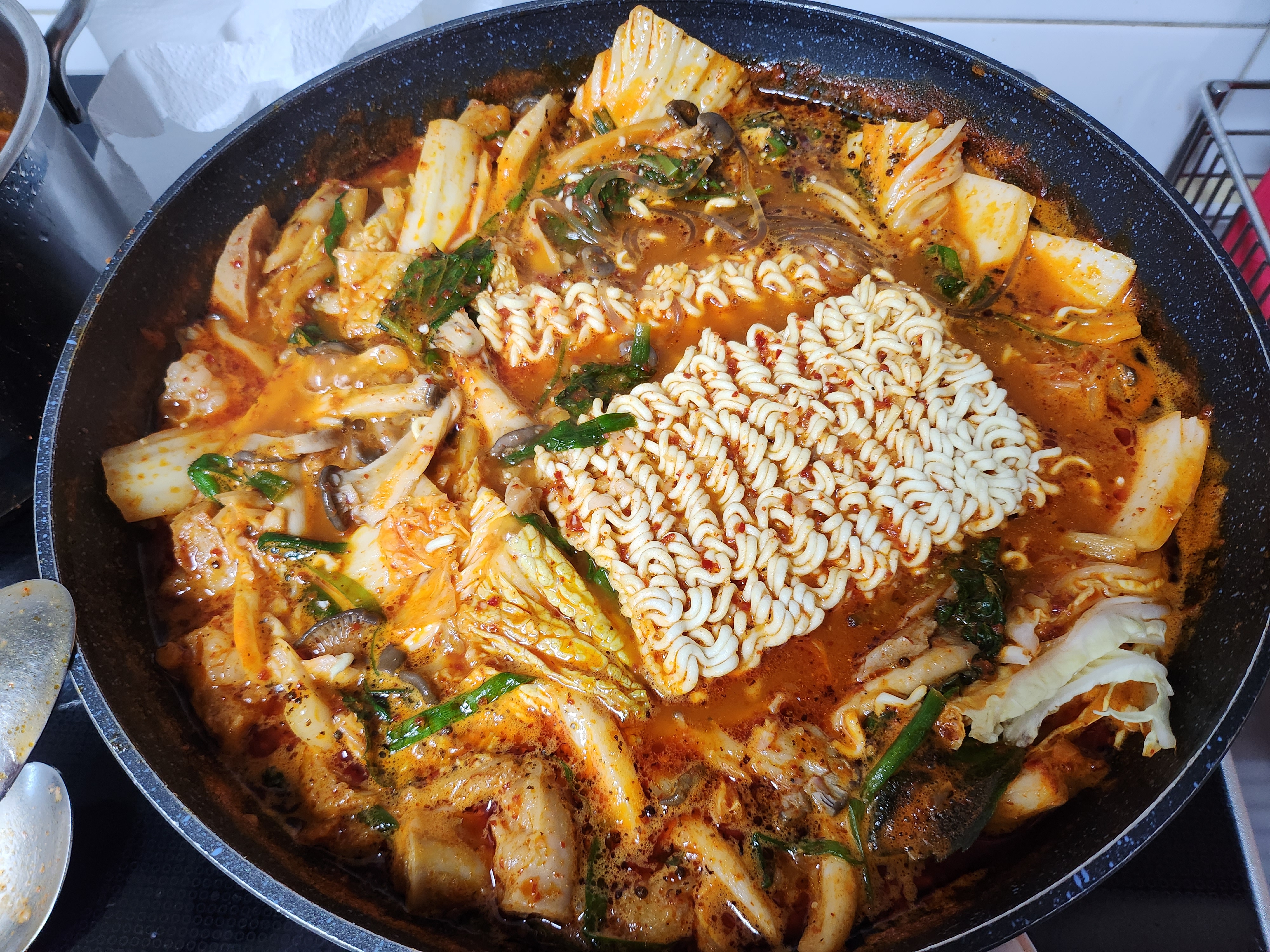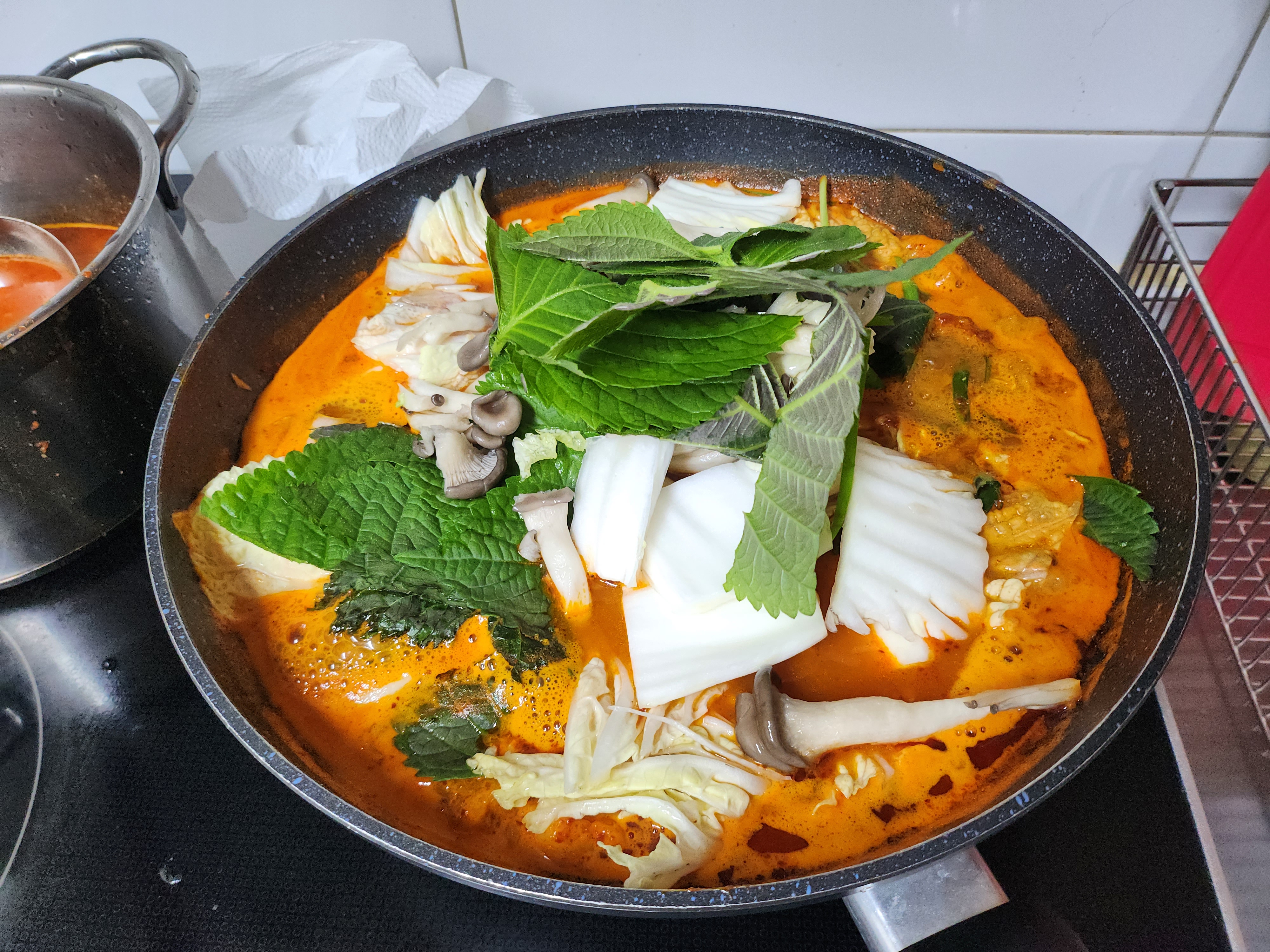 물이 끓고 당면과 라면사리, 깻잎을 넣었습니다.