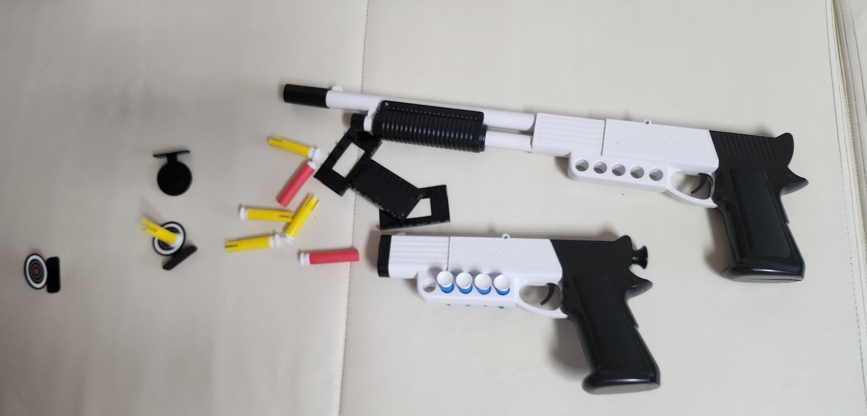 공기총이 2개가 있고 뽁뽁이가 달린 총알이 15개 들어있습니다.