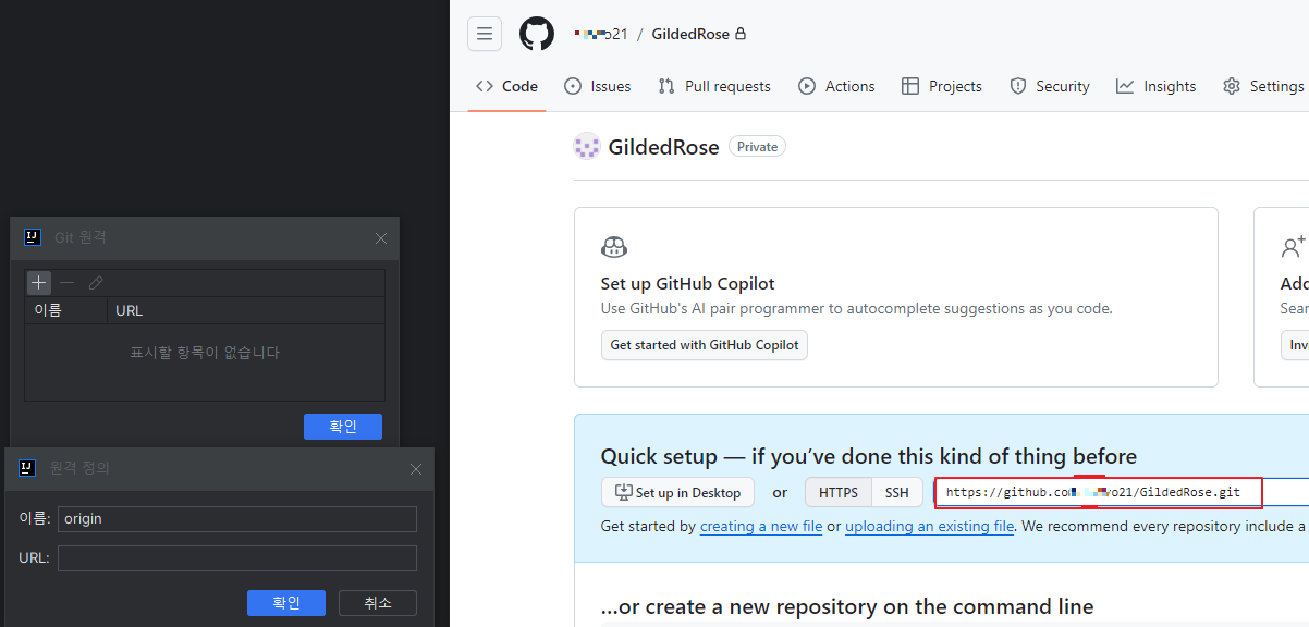 4. 깃헙에 생성한 레파지토리 주소를 등록합니다.
