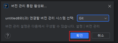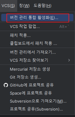 2. VCS 메뉴에서 버전 관리 통합 활성화를 누르고 Git을 선택합니다.