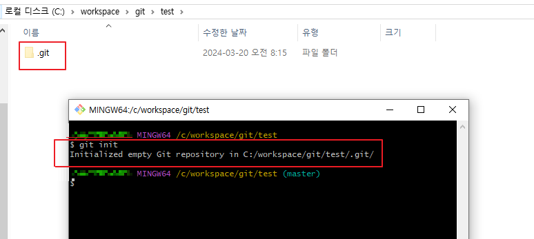 5. git init 명령어를 사용하면 해당 위치에 .git 숨긴 폴더가 생깁니다.