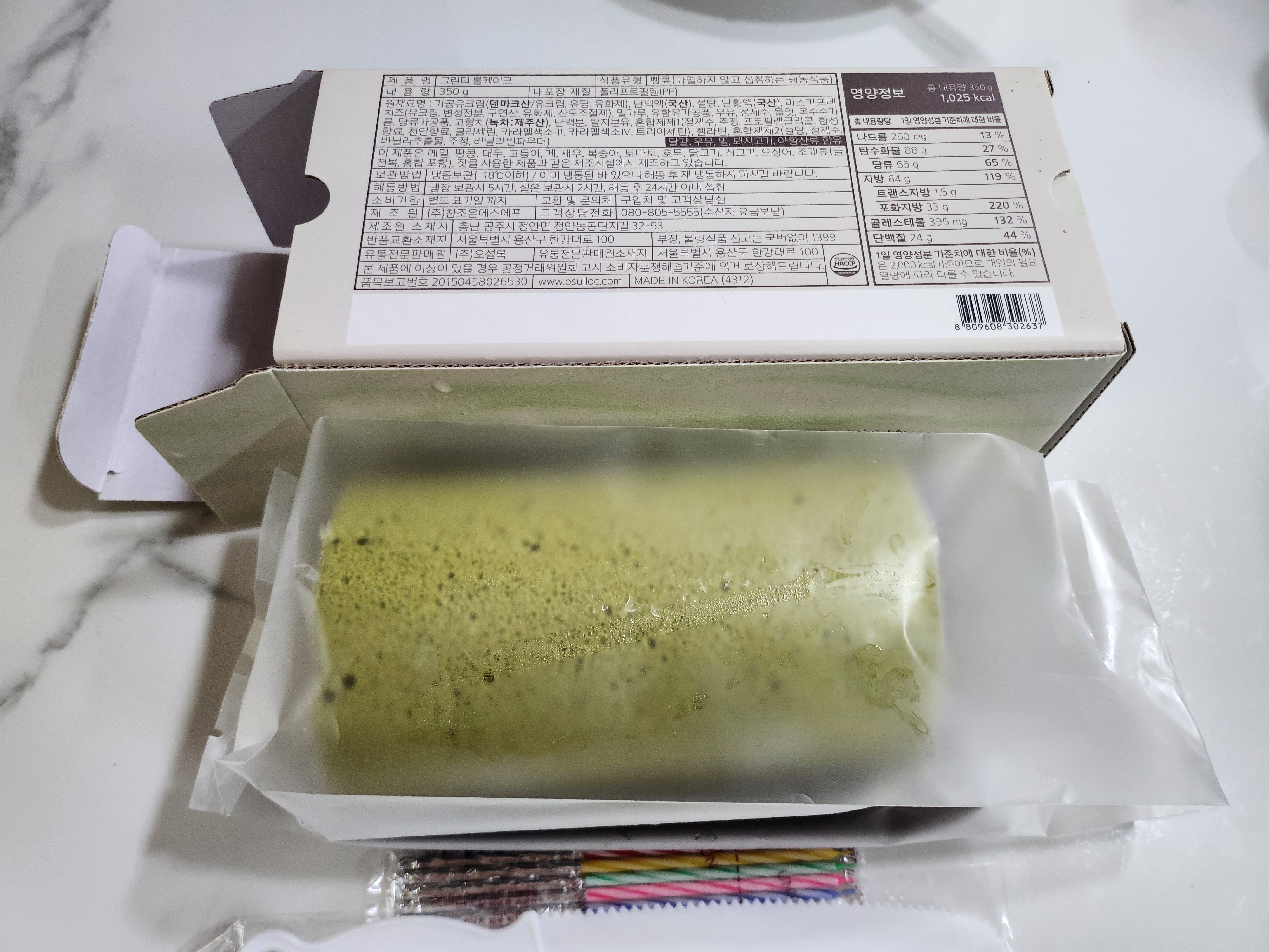 그린티 롤케이크 제품인데 냉동 보관했다가 녹여먹었습니다.
