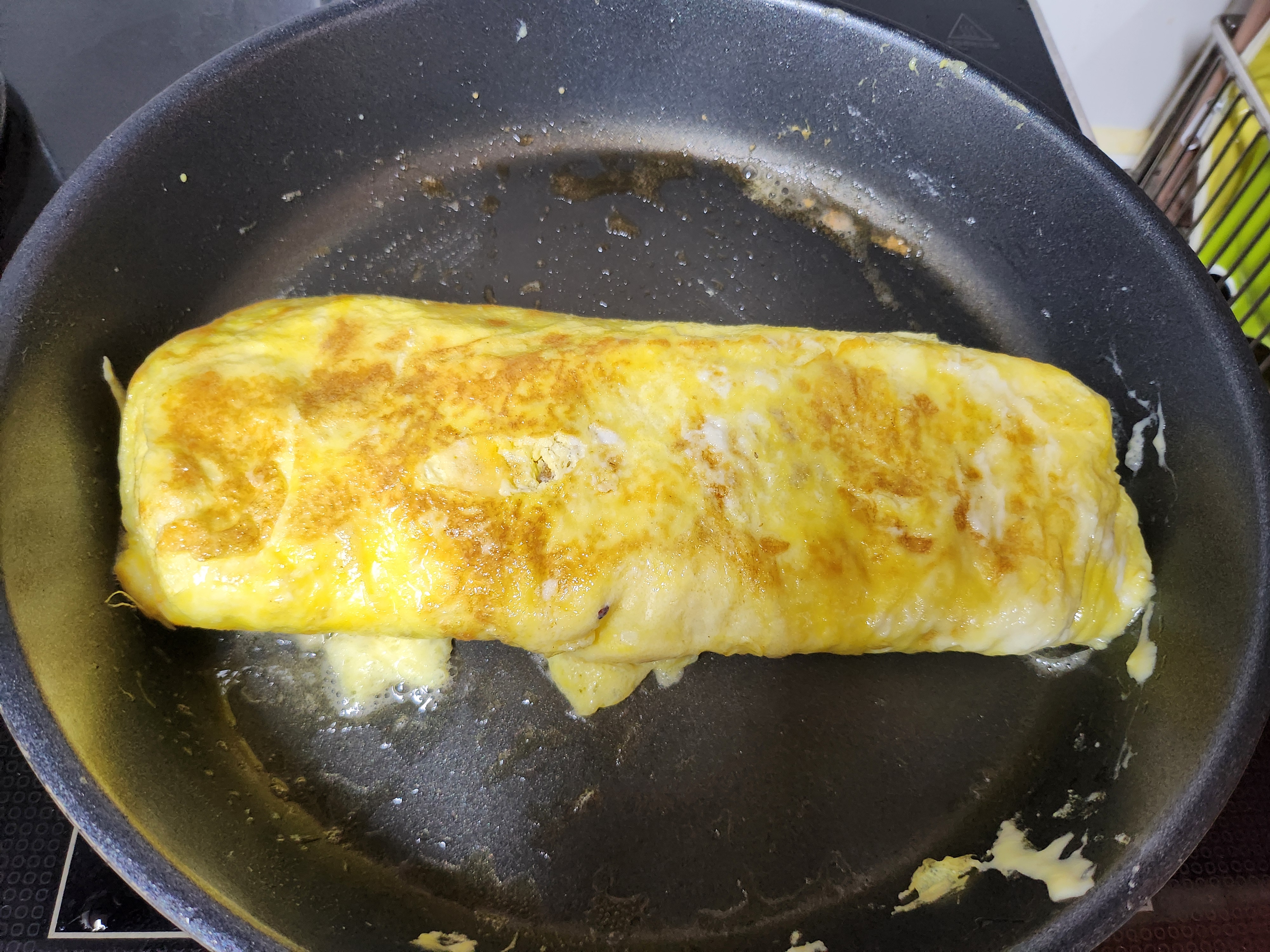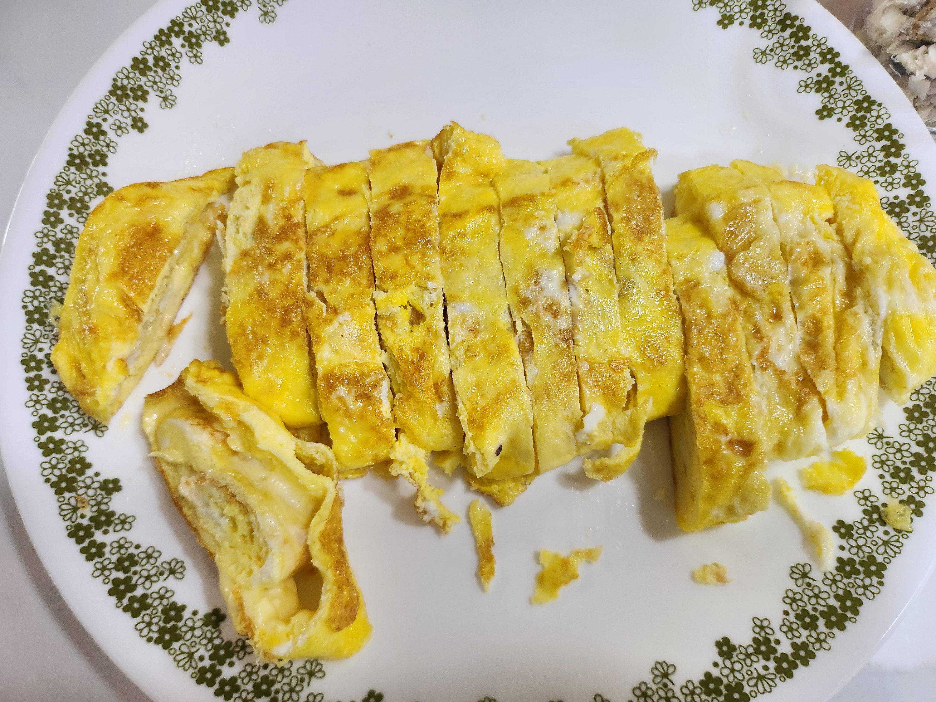 돌돌 굴리며 익히다 보면 커다란 치즈 계란말이가 완성됩니다.