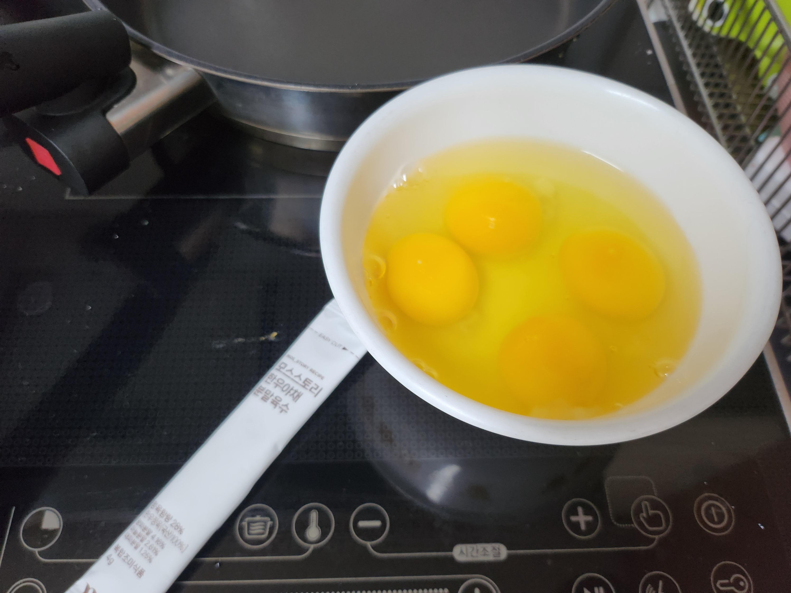 계란을 잘 풀고 기름을 두른 프라이팬에 얇게 익힙니다.