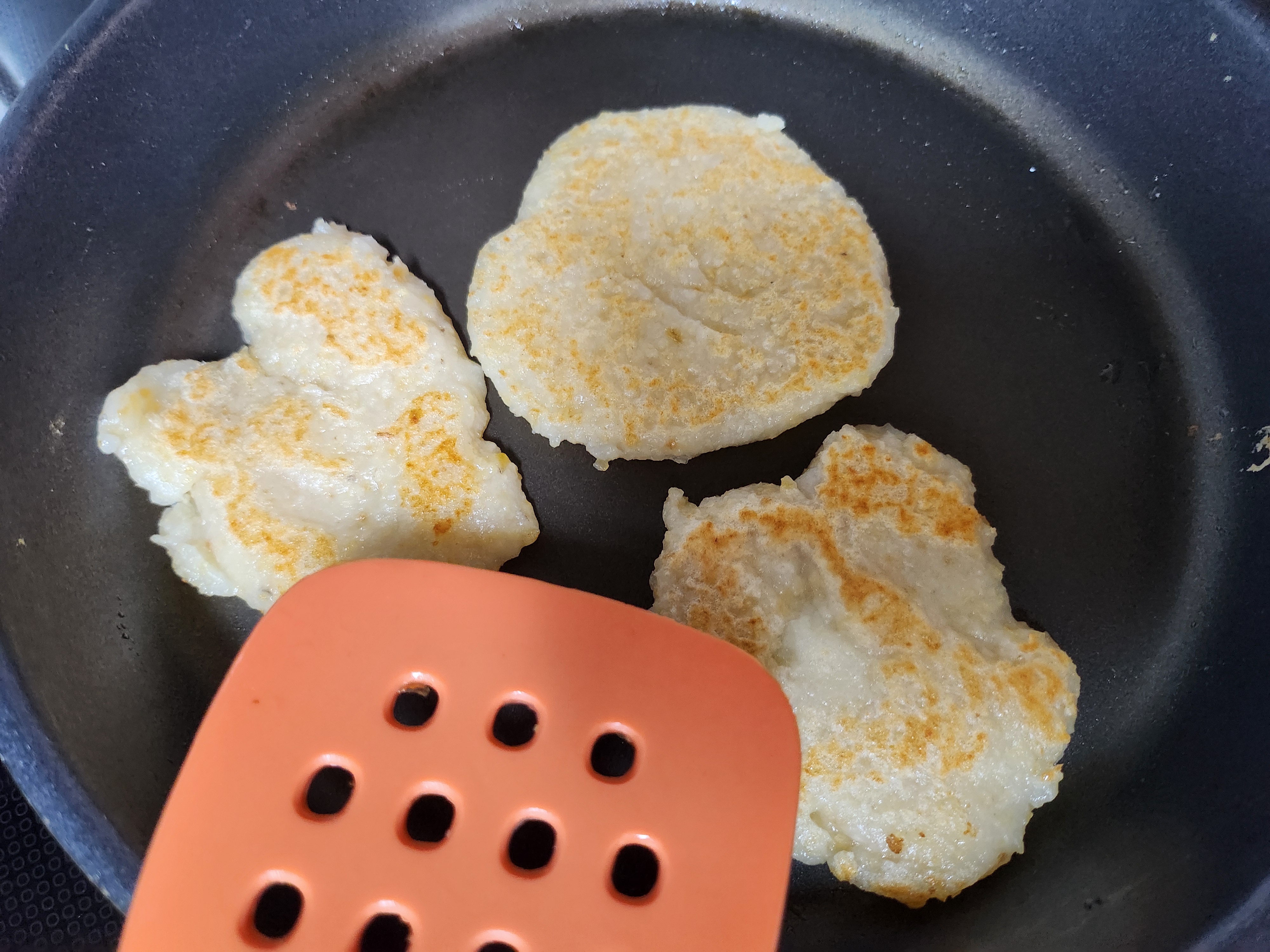 물과 믹스를 섞어서 반죽을 프라이팬에 노릇하게 굽기만 하면 완성입니다.