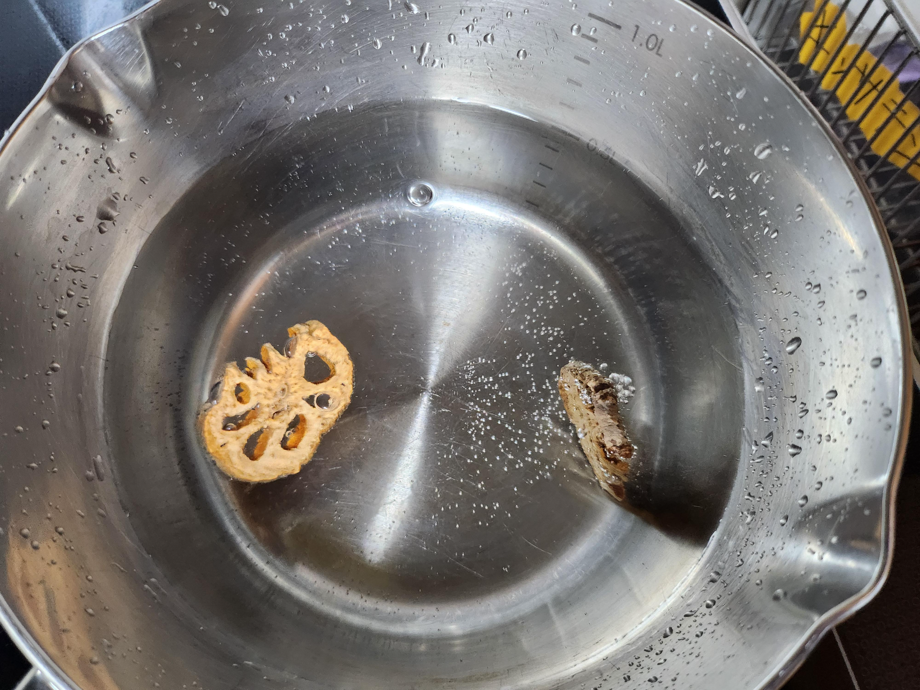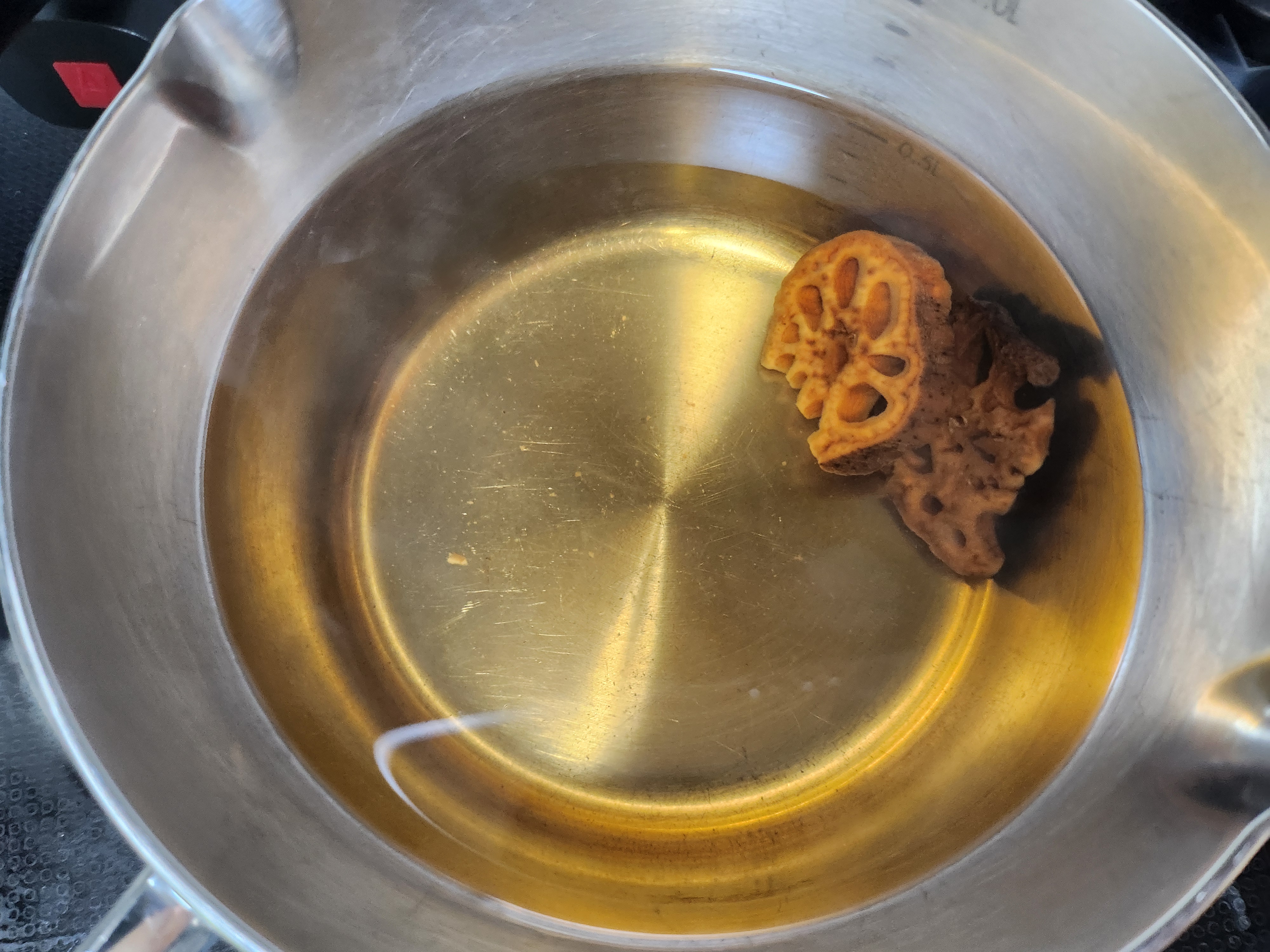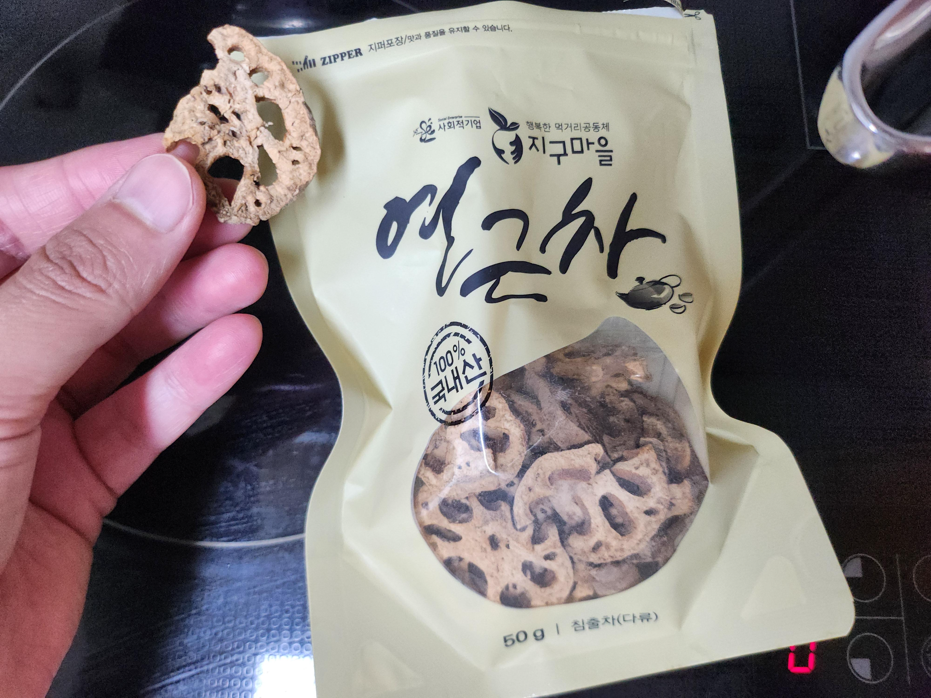 차를 우리는 연근 제품을 사서 500ml 물에 두 개 정도 넣고 끓여줍니다.