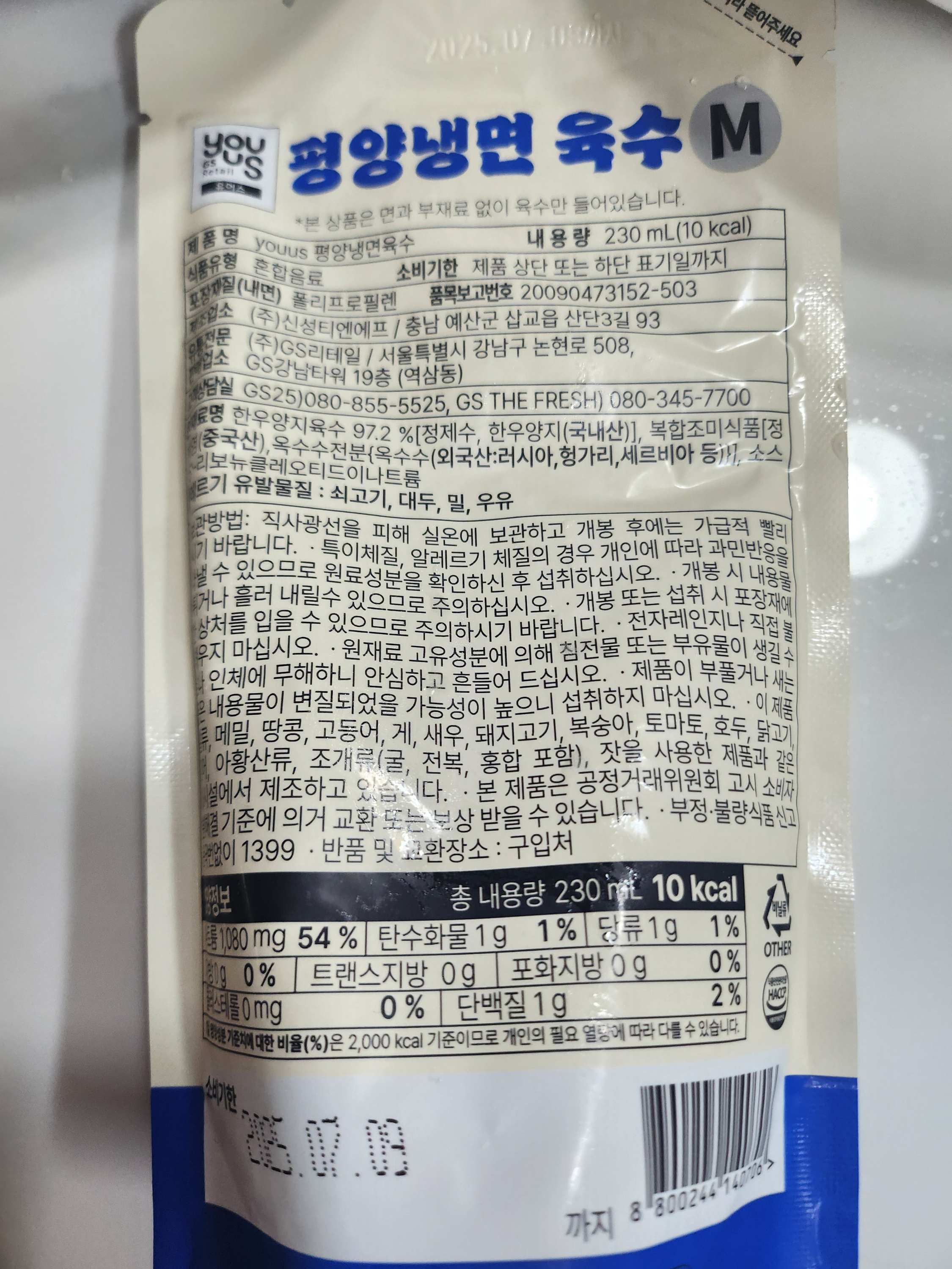 유어스 제품으로 평양냉면 육수 230ml를 파우치 형태를 판매합니다.