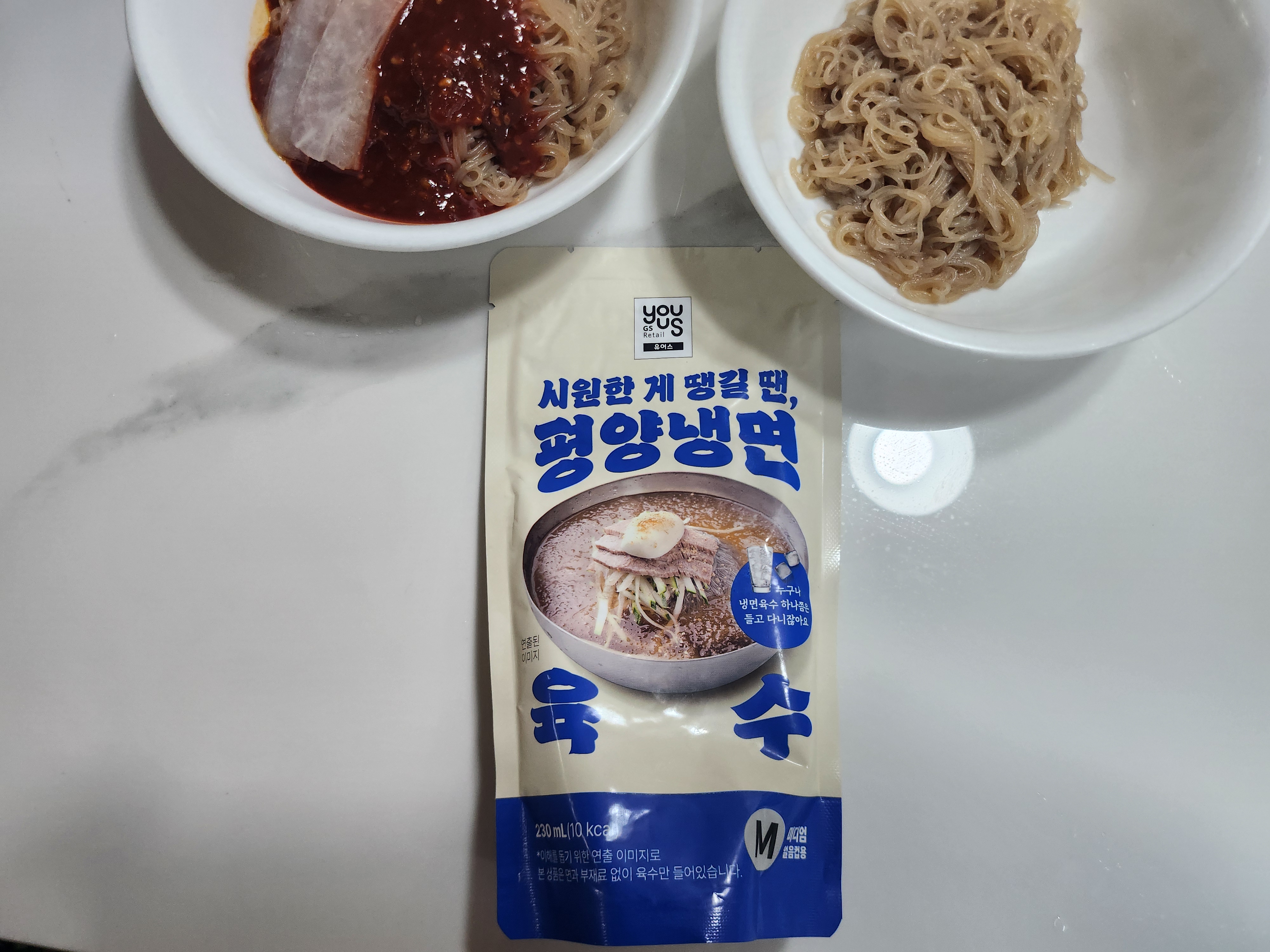 집에 비빔냉면이 있어서 반은 평양냉면 육수를 부어 먹었습니다.