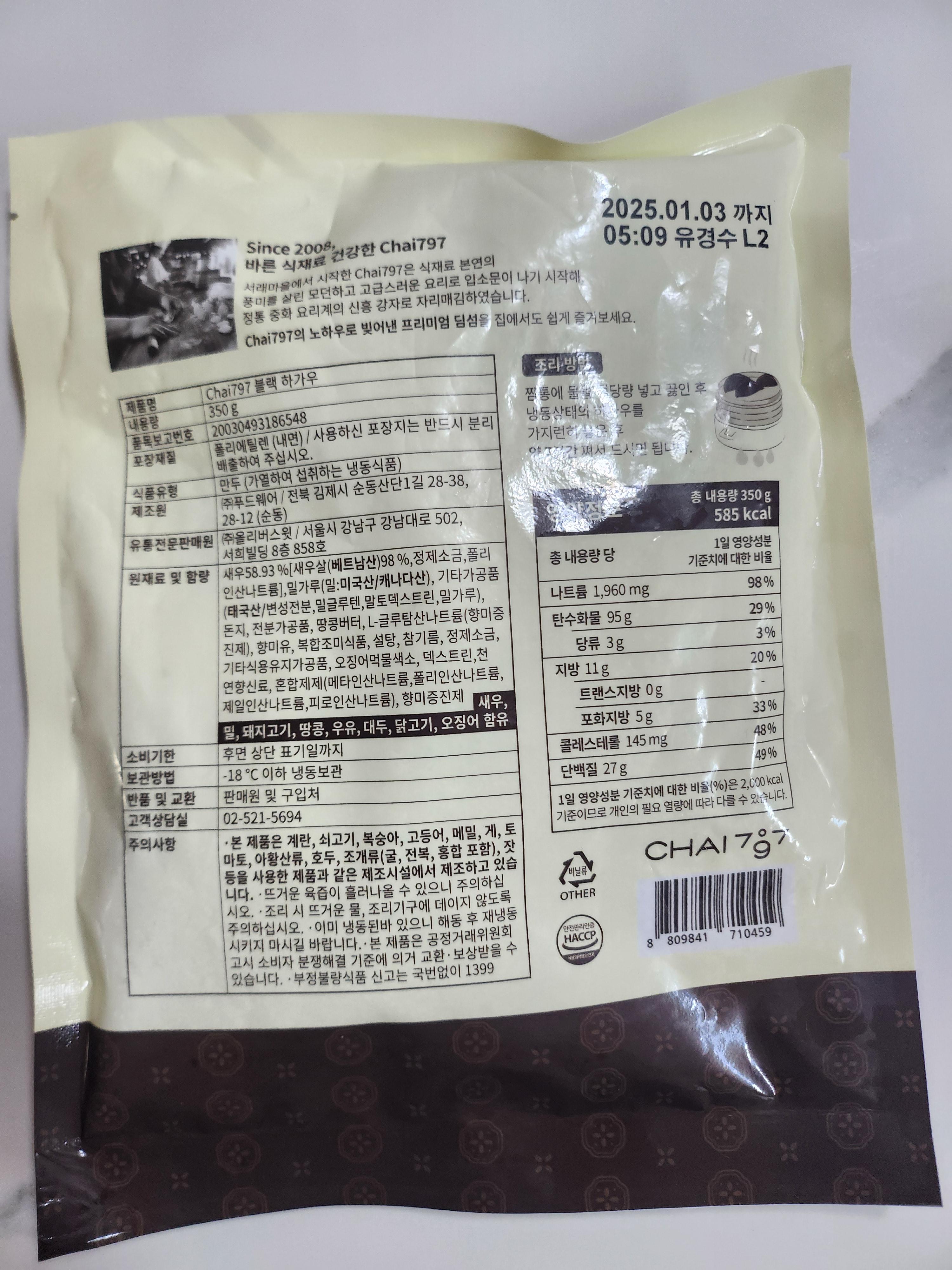 광화문과 서래마을의 중식당으로 유명한 차이797의 블랙하가우 냉동 제품입니다.