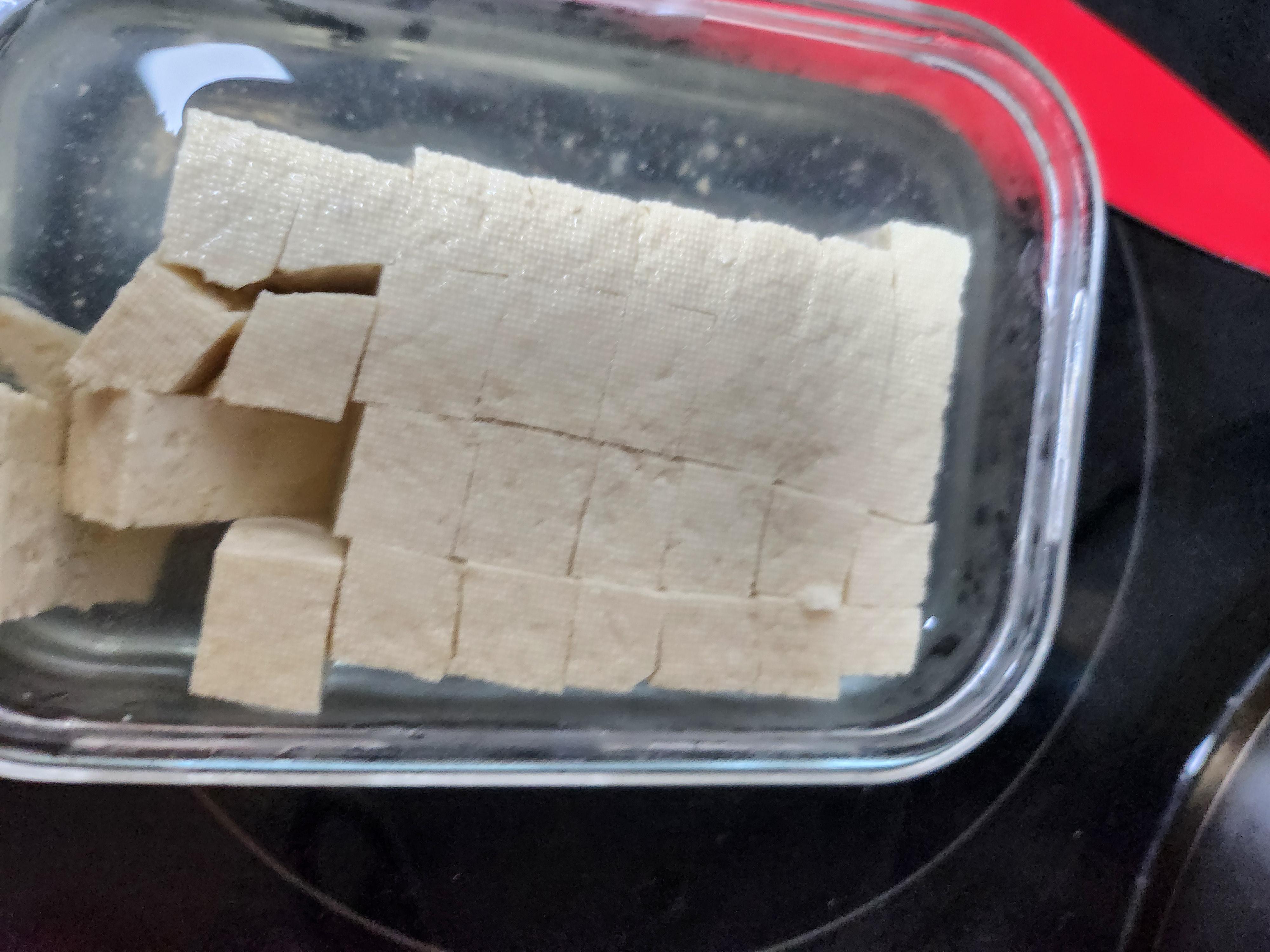 두부는 보관하던 그릇에 담긴채 칼로 깍둑썰기 했습니다.