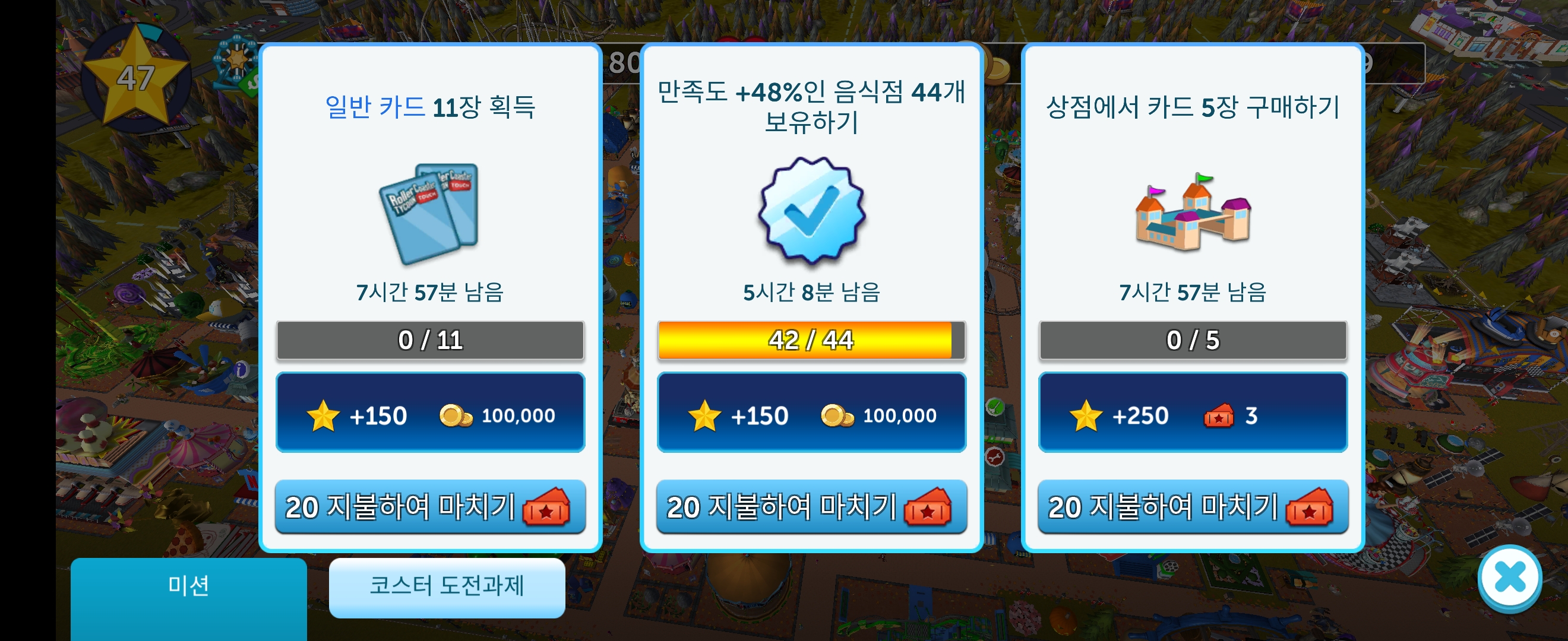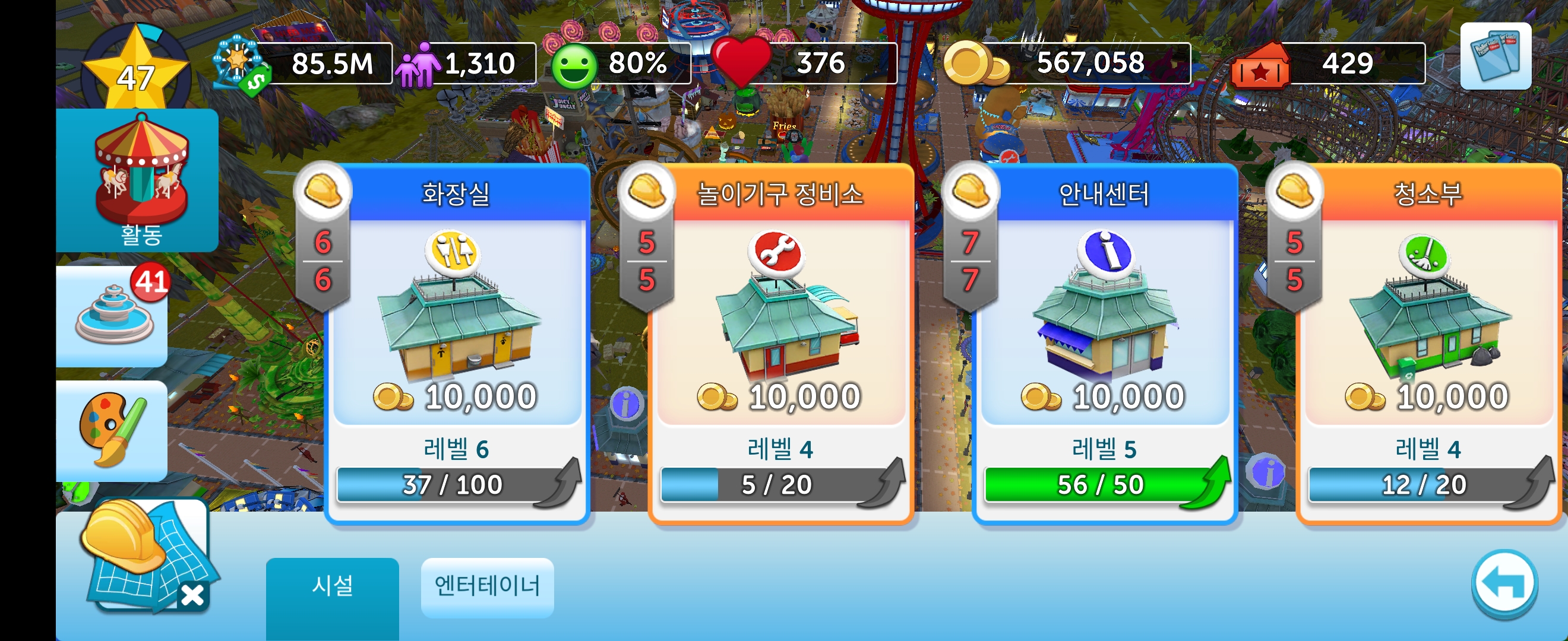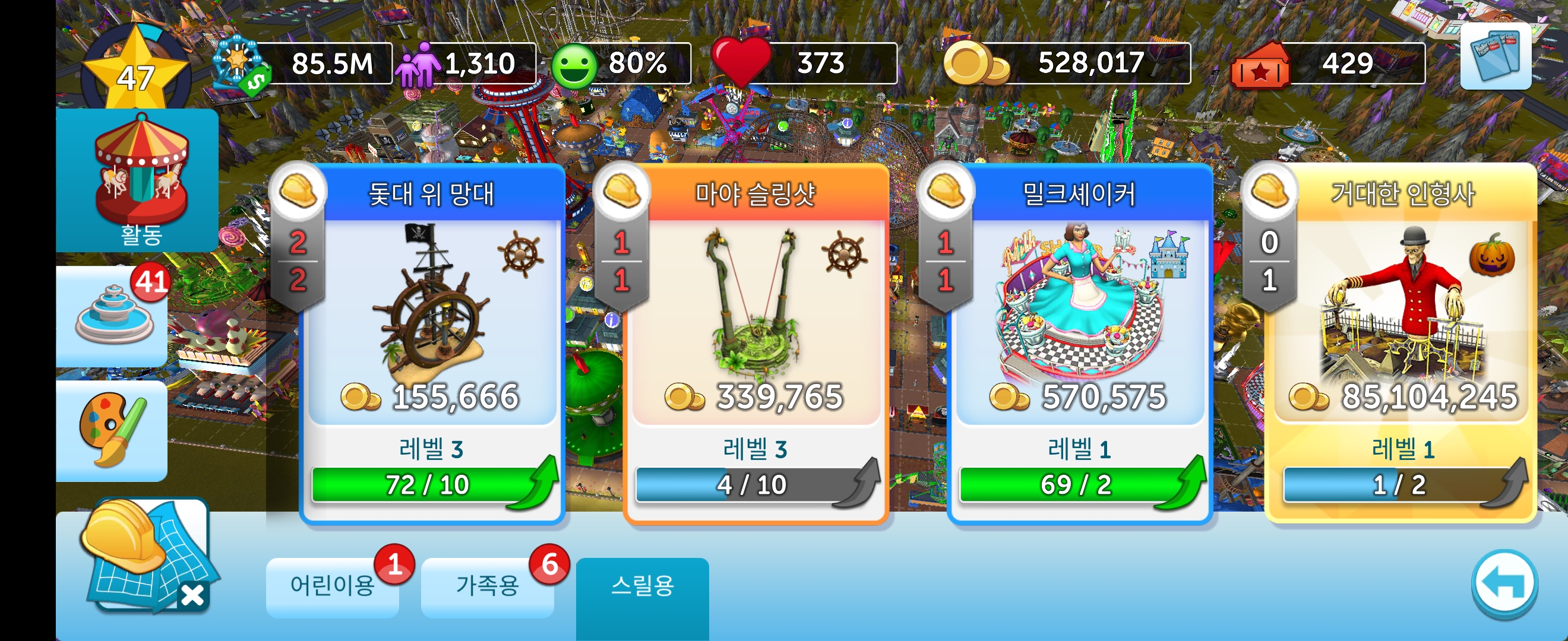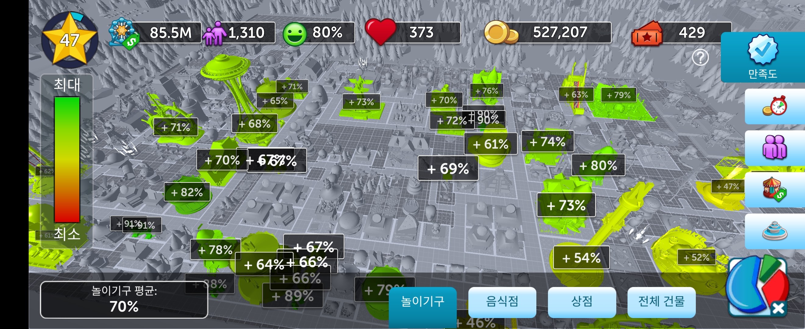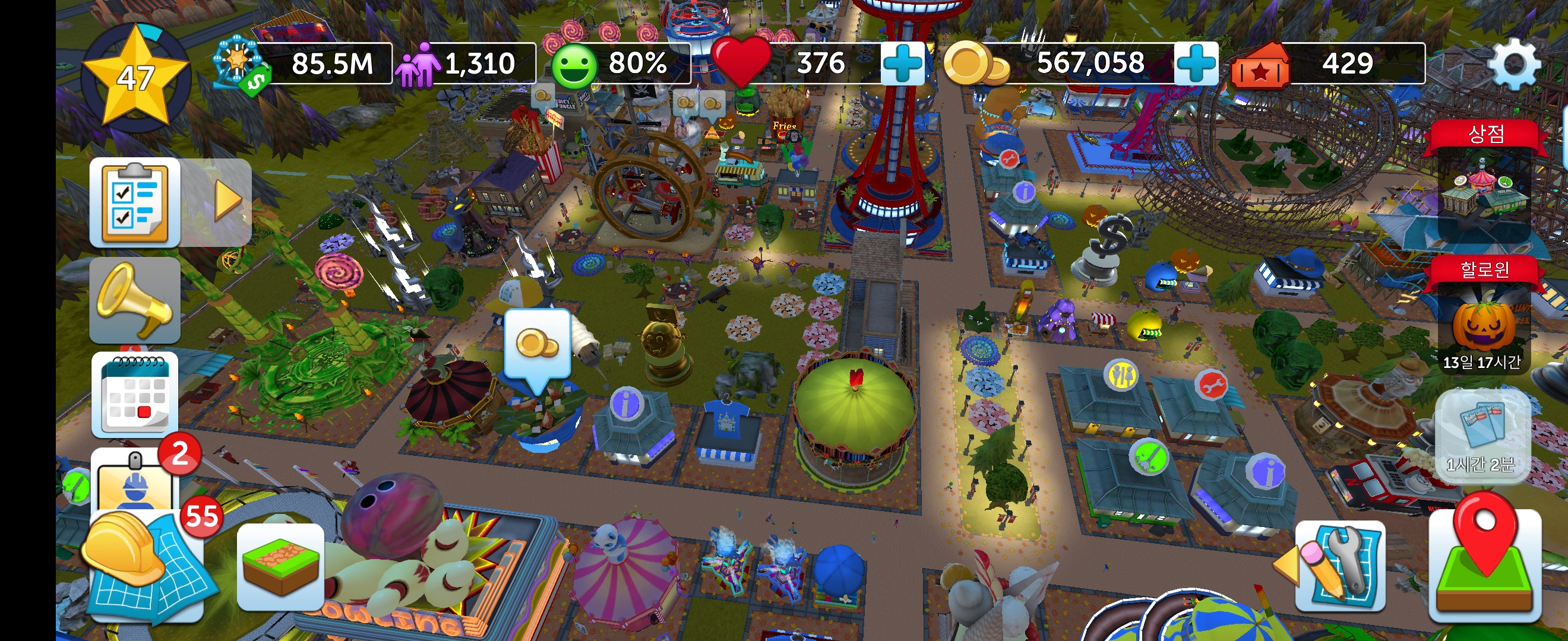 게임을 하다 보면 놀이기구와 업그레이드 비용이 많이 들어 정체되는 구간이 발생합니다.