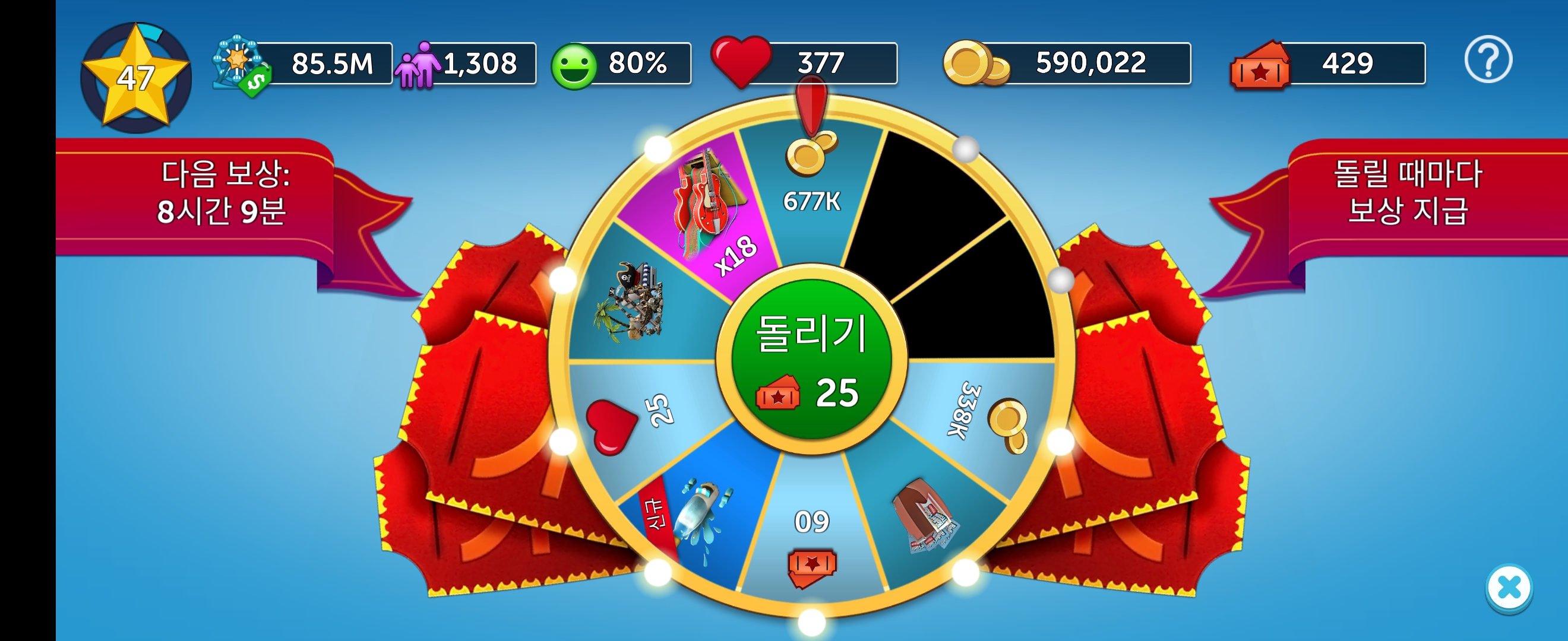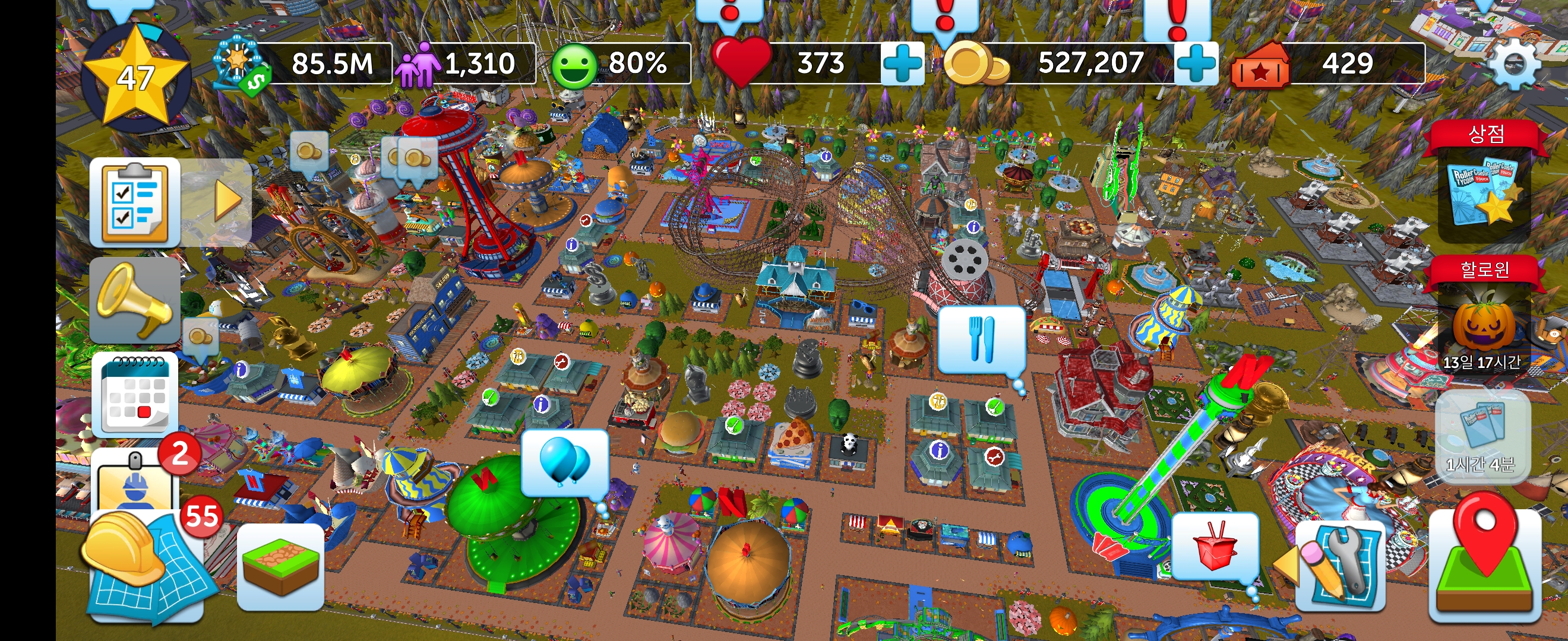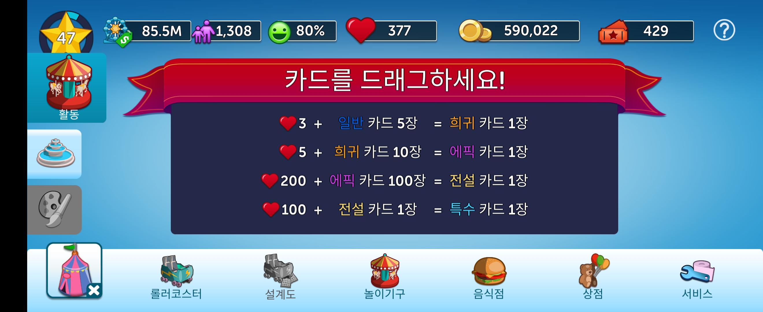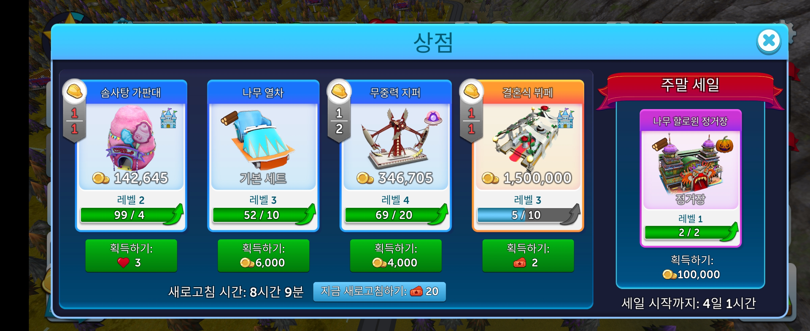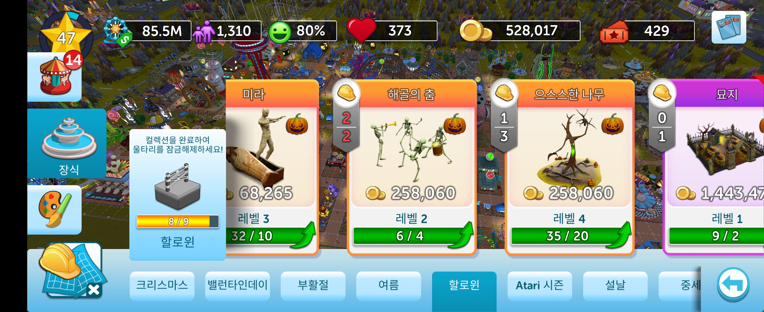 게임을 하다 보면 놀이기구와 업그레이드 비용이 많이 들어 정체되는 구간이 발생합니다.