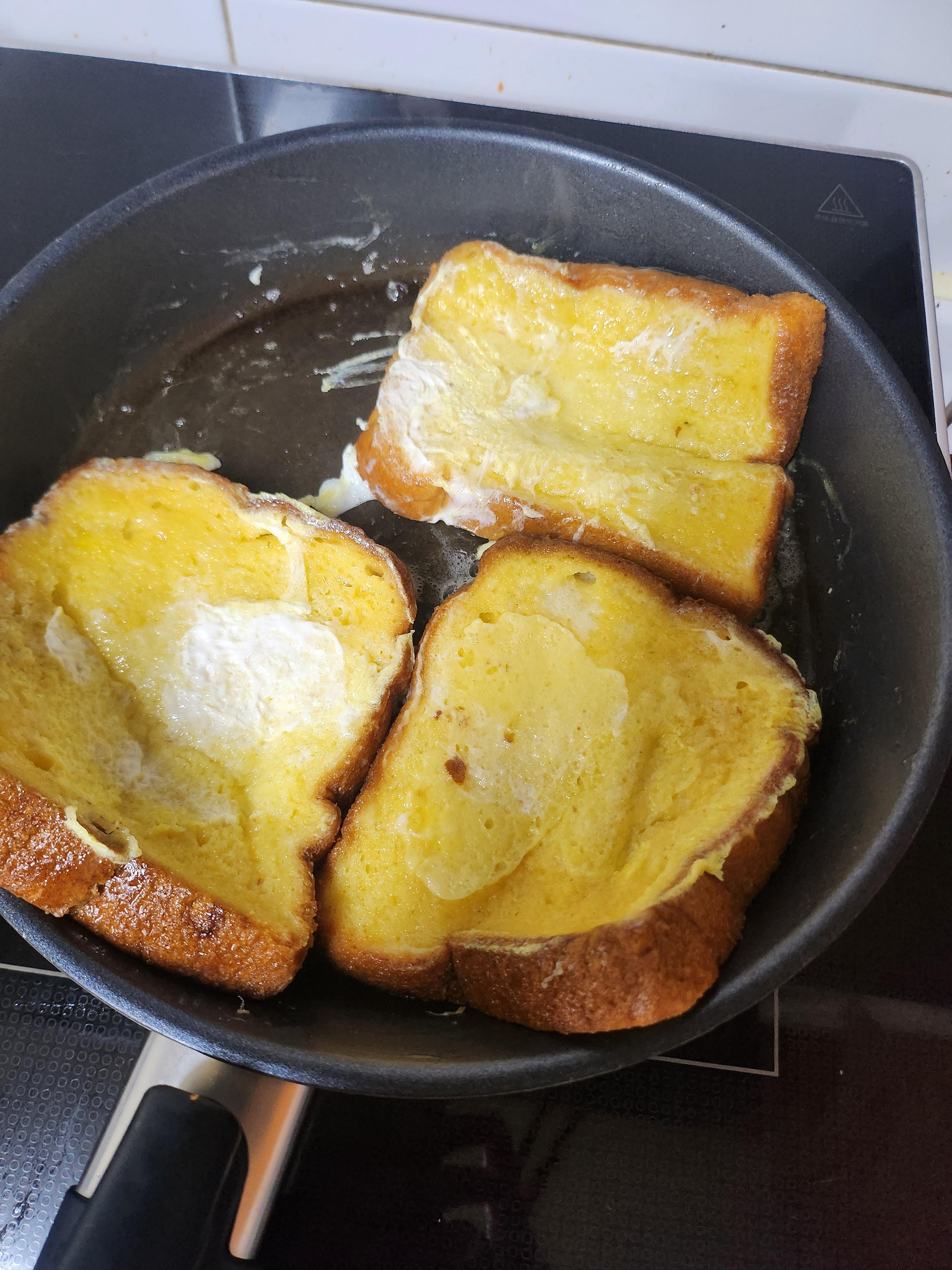 계란물을 입힌 식빵을 중불에 뒤집어가며 노릇노릇하게 굽습니다.
