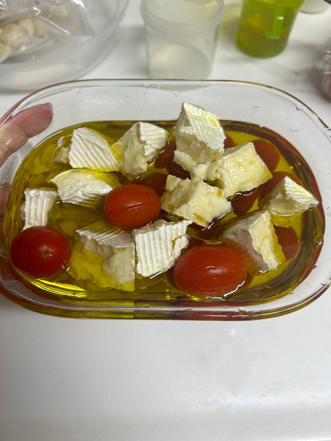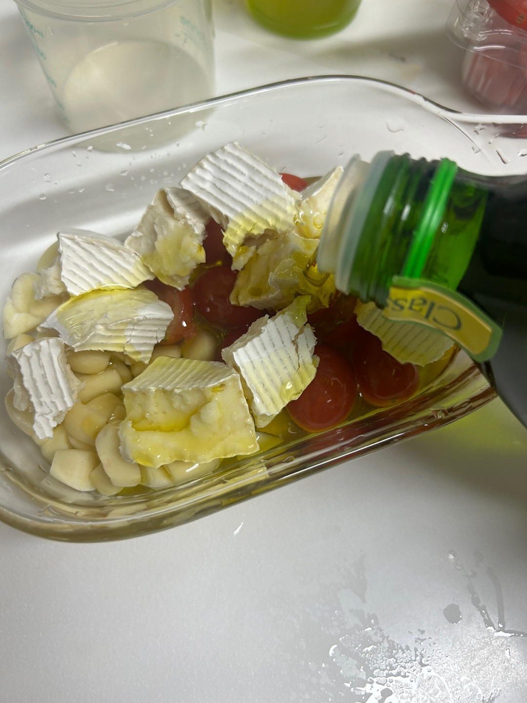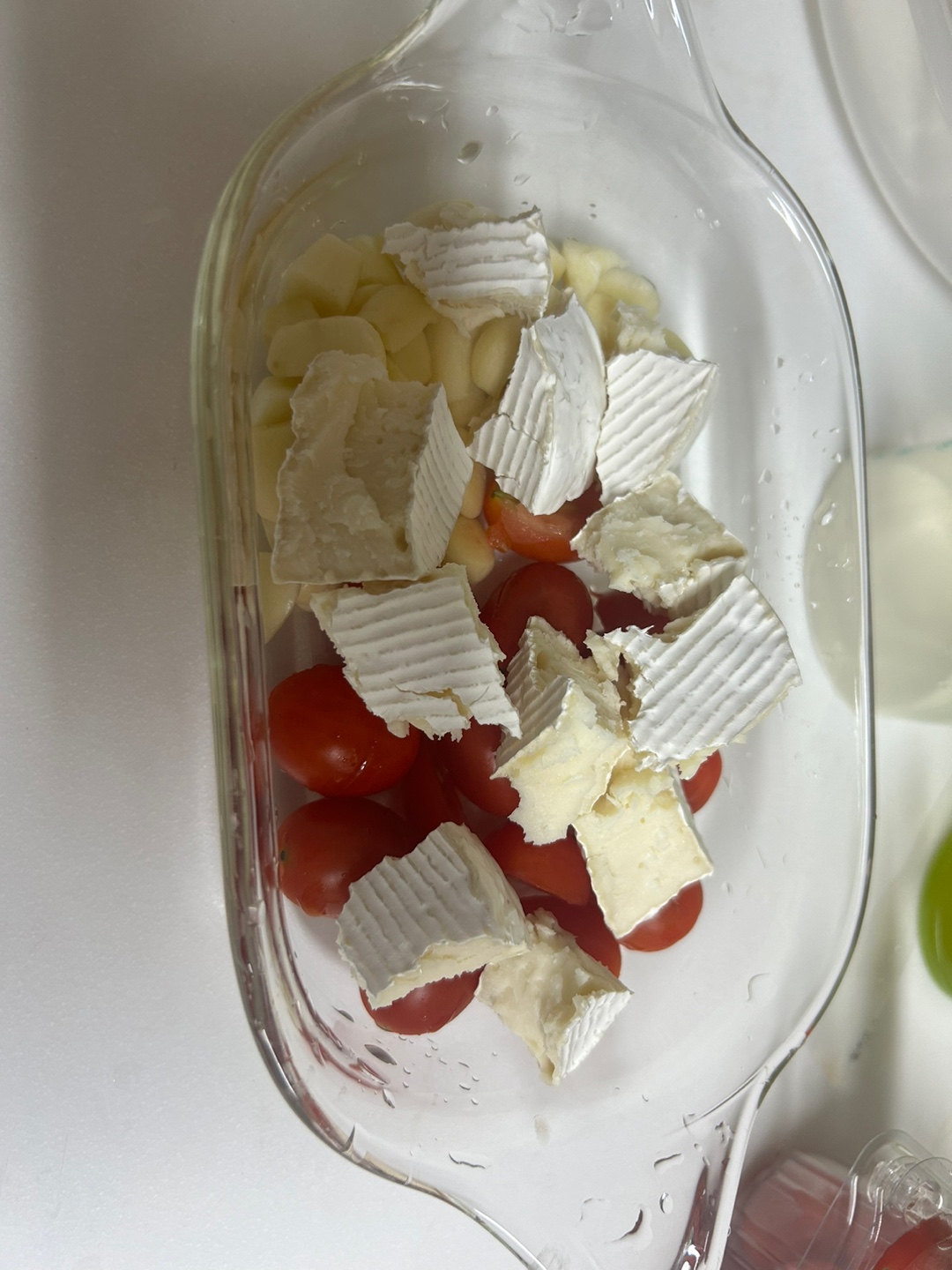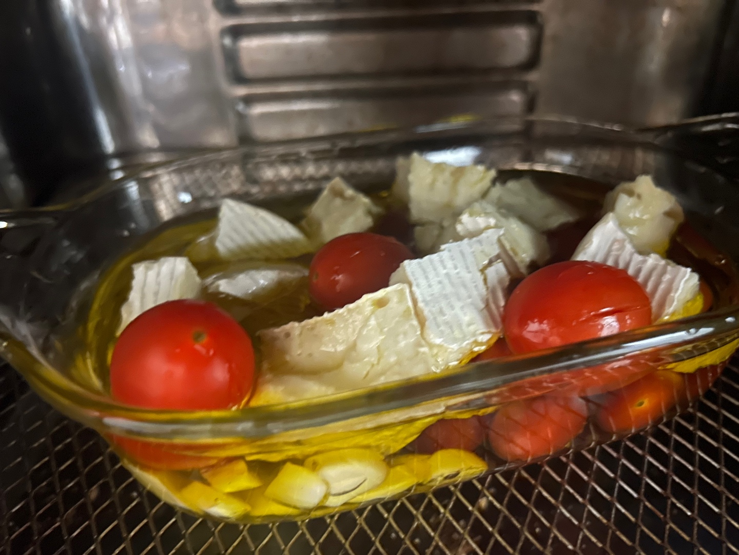 에어프라이어 용기에 마늘, 방울토마토, 브리치즈를 잘라 넣습니다.